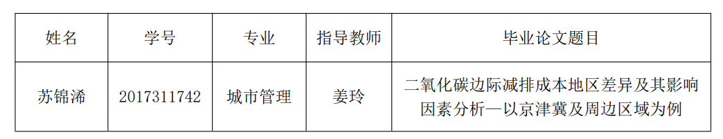 近日,2021年北京市普通高等学校优秀本科生毕业设计(论文)评选结果公布,bat365官网2017级城市管理专业本科生苏锦浠的毕业论文荣获优秀毕业设计(论文),论文题目为《二氧化碳边际减排成本地区差异及其影响因素分析—以京津冀及周边区域为例》,指导教师为姜玲教授。