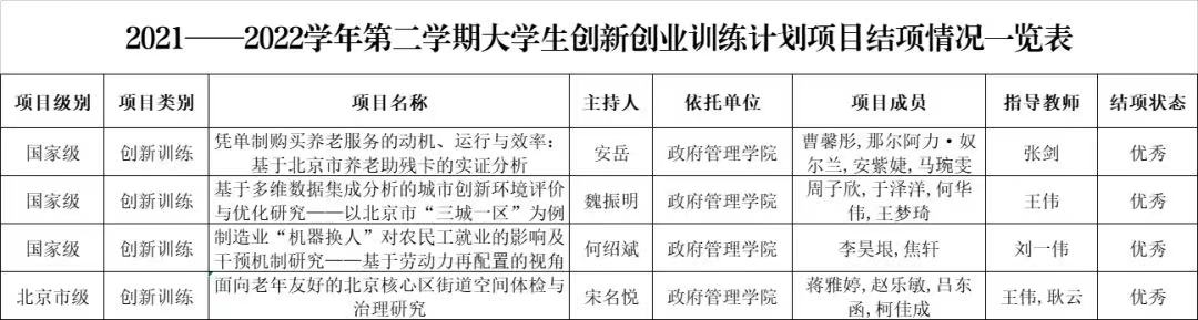 近日,学校发布《关于公布 2021-2022 学年第二学期大学生创新创业训练计划项目结题验收和级别认定结果的通知》,对往期 250项大学生创新创业训练计划项目进行了结题验收和级别认定工作。其中,bat365官网4项创新训练项目获得结项优秀的好成绩,包括3项国家级项目和1项北京市级项目。