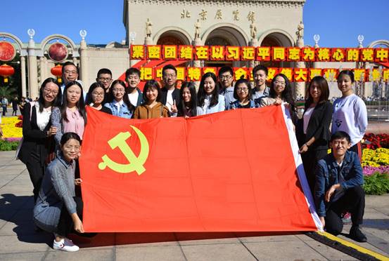 9月29日上午,在院长助理李宇环副教授带领下,支部抵达了北京展览馆。在“紧密团结在以习近平同志为核心的党中央周围”“把中国特色社会主义伟大事业不断推向前进”的两行振奋人心的金黄色大字前,师生满怀热情地在此合影留念。