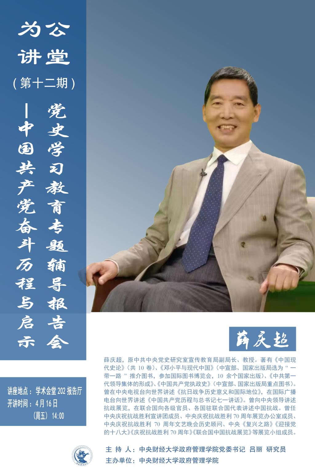 嘉宾简介:薛庆超,原中共中央党史研究室宣传教育局副局长、教授。著有《中国现代史论》(共10卷)、《邓小平与现代中国》(中宣部、国家出版局选为“一带一路”推介图书,参加国际图书博览会,10余个国家出版)、《中共第一代领导集体的形成》、《中国共产党执政史》(中宣部、国家出版局重点图书)。曾在中央电视台向世界讲述《抗日战争历史意义和国际地位》,在国际广播电台向世界讲述《中国共产党历程与总书记七一讲话》。曾向中央领导讲述抗战展览,在联合国向各级官员、各国驻联合国代表讲述中国抗战。曾任中央庆祝抗战胜利宣讲团成员、中央庆祝抗战胜利70周年展览办公室成员、中央庆祝抗战胜利70周年文艺晚会历史顾问、中央《复兴之路》《迎接党的十八大》《庆祝抗战胜利70周年》《联合国中国抗战展览》等展览小组成员。