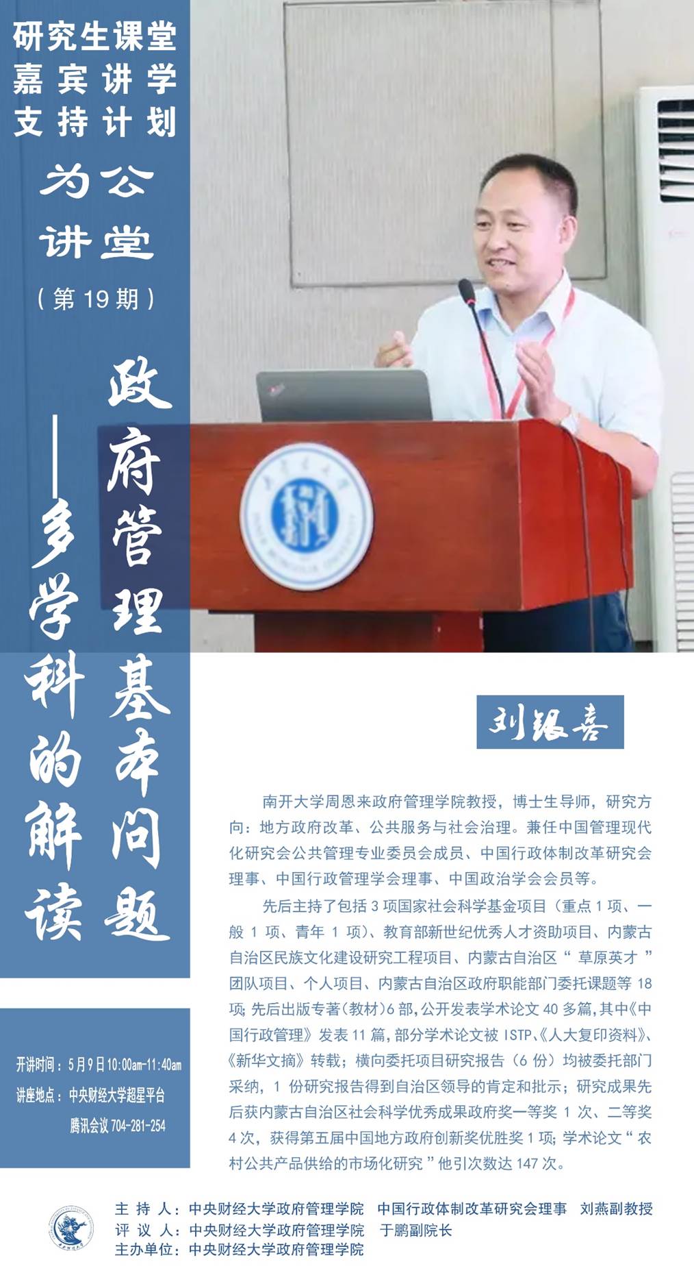 嘉宾简介:刘银喜,南开大学周恩来bat365中文官网登录入口教授,博士生导师。研究方向:地方政府改革、公共服务与社会治理。兼任中国管理现代化研究会公共管理专业委员会成员、中国行政体制改革研究会理事、中国行政管理学会理事、中国政治学会会员等。先后主持了包括3项国家社会科学基金项目(重点1项、一般1项、青年1项)、教育部新世纪优秀人才资助项目、内蒙古自治区民族文化建设研究工程项目、内蒙古自治区“草原英才”团队项目、个人项目、内蒙古自治区政府职能部门委托课题等18项;先后出版专著(教材)6部,公开发表学术论文40多篇,其中《中国行政管理》发表11篇,部分学术论文被ISTP、《人大复印资料》、《新华文摘》转载;横向委托项目研究报告(6份)均被委托部门采纳,1份研究报告得到自治区领导的肯定和批示;研究成果先后获内蒙古自治区社会科学优秀成果政府奖一等奖1次、二等奖4次,获得第五届中国地方政府创新奖优胜奖1项;学术论文“农村公共产品供给的市场化研究”他引次数达147次。