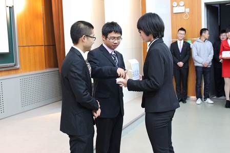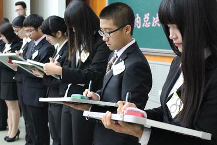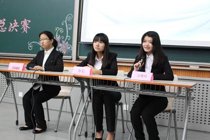 在“市长PK”环节,模拟市长作为团队的核心,他们之间个人的较量自然成为本次比赛最为激烈的部分。专家评委王伟老师以如何“让APEC蓝常态化”为关注点,向“市长们”发问。“市长们”依次条理清晰、简洁明了的作答,可谓各有千秋,难分伯仲。最终,通过来自19个学院的21名大众评审的现场投票,“bulingbuling”队市长贺顶丹成为本届大赛的最佳市长。