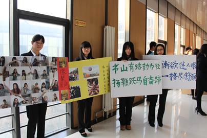 在国政13班5分钟的展示时间内,两名主讲人用慷慨激昂的语调介绍了班级在大学一年级取得的成绩,将每位同学的成绩和班级团体成绩全部展现在大家的面前。为了配合两位同学的解说,也为了更具说服力,20多位同学手举贴满各类证书奖状的展板。整场展示极具画面感和感染力,介绍基调昂扬,现场气氛热烈,观众反响强烈。介绍完毕,两位同学代表接受评委提问,用谦逊又不失精准的语句回答评委的问题,充分体现了国政人的情商和应变力。