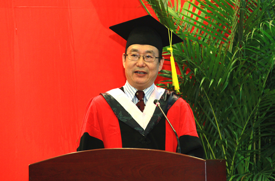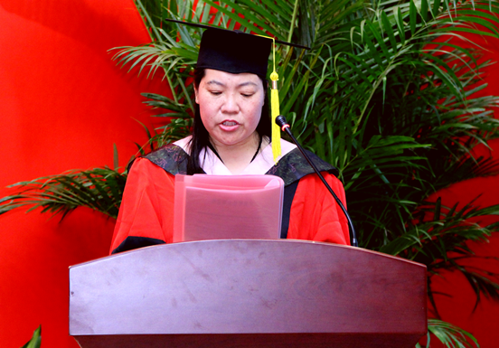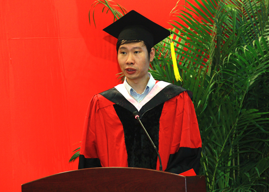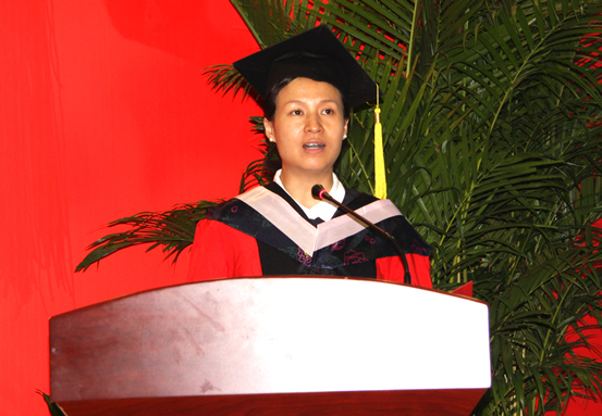 在热烈的掌声中,赵景华院长上台致辞。赵院长首先对同学们顺利完成学业,获得相应的学士学位、硕士学位或博士学位表示衷心的祝贺,向辛勤哺育同学们成长的家长、悉心教导同学们成才的老师表示诚挚的感谢。接着,赵院长回顾了学院自2011级本科生进校时的特殊时间节点——建院5周年以来的发展历程,指出在已有成绩的基础上,学院学科布局更加合理,学科特色更加鲜明,以四大专业特色浓郁的品牌学生活动为代表的第二课堂开展得有声有色,有力地促进了同学们的成长成才。2013级研究生入校以来所举办的国际研讨会,在全国MPA论文评选中斩获佳绩,国际领导力研修班的开展,国家级学会落户bat365官网,无一不彰显bat365官网人才培养所取得的成就和学术影响力的显著提升,由此指出虽然学院成立时间不长,但取得了长足的进步,这与每一位老师和同学的辛勤努力是分不开的,每一个“中央政府人”都有理由为之感到骄傲和自豪。赵院长对毕业生们嘱托道,当今的中国已经处在一个转型的十字路口,经济、社会、环境等各个方面都已经进入发展的新常态。国家的“一带一路”倡议和反腐倡廉给同学们带来了新的发展机会,在同学们离校即将踏上新的征程之际,希望同学们能做到牢记院训,守住底线;充满希望、敢于担当;学无止境,虚心求索。告诫同学们既要志存高远,积极进取,但又要守住规则,追求具有精神意义和一定境界的卓越和成功;只要同学们满怀希望,坚韧不拔,敢于担当,勇于创新,向着天穹勇敢地飞翔,就能实现自己的梦想;世界那么大,要去探索和发现,去了解那些已知的未知和探索未知的未知,虚怀若谷,谦虚谨慎,边干边学,才能无限向心灵的自由王国驶进。
