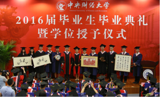 老师们在同学们的掌声和欢呼中入场。随后,师生共同观看“我们一起走过”毕业纪念视频,视频由2016届毕业生的学习生活照和采访视频组成,深情回顾了同学们中财岁月的点点滴滴,述说了同学们对未来的憧憬,对生活的感知,让人回味良久。庄严的国歌声正式拉开了典礼的帷幕。副院长于鹏宣读《关于2016届本科生毕业及授予学士学位的决定》和《关于2016届研究生毕业及授予学士学位的决定》,党总支书记吕丽宣读《关于表彰2016届本科优秀毕业本科生的通知》及《关于表彰2016届优秀毕业研究生的通知》。赵景华院长及栗玉香教授为优秀本科毕业生及优秀研究生毕业生颁发荣誉证书并与同学们合影留念。