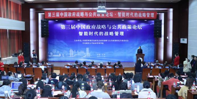 2019年11月24日上午,由中国管理现代化研究会政府战略与公共政策研究专业委员会、bat365中文官网登录入口共同主办的“第三届中国政府战略与公共政策论坛——智能时代的战略管理”,在我校学术会堂202报告厅隆重举行。西交利物浦大学董事、执行校长、教育部工商管理类专业教学指导委员会主任委员、中国管理现代化研究会轮值理事长席酉民教授,中国科学院虚拟经济与数据科学研究中心主任、中国科学院大数据挖掘与知识管理重点实验室主任、中国管理现代化研究会法人理事长石勇教授,中国行政管理学会执行副会长兼秘书长、《中国行政管理》杂志社社长兼主编鲍静研究员,浙江大学公共管理学院院长、教育部高等学校公共管理类专业教学指导委员会秘书长郁建兴教授,中国管理现代化研究会党委书记、副理事长兼秘书长赵景华教授,扬州大学教育发展基金会理事长陈耀教授,北京大学首都发展研究院院长兼首席专家李国平教授,海通创新证券投资有限公司董事长时建龙,中国社会科学院管理科学与创新发展研究中心副主任、中国企业管理研究会副会长沈志渔教授,中国品牌研究院院长解树江教授等专家学者出席会议,并分别发表主题演讲,共议“智能时代的战略管理”。