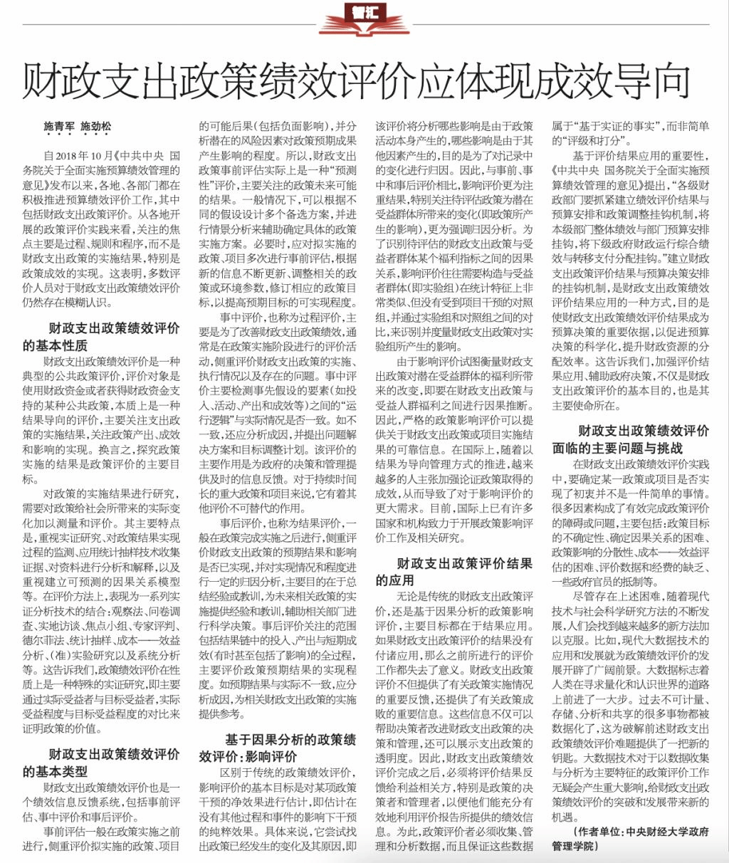 2022年7月23日,bat365官网行政管理系主任、中国财政学会理事、财政部等部委特聘绩效评价咨询专家施青军教授,在《中国财经报》第6353期第7版“绩效新时代”专刊发表文章:《财政支出政策绩效评价应体现成效导向》。