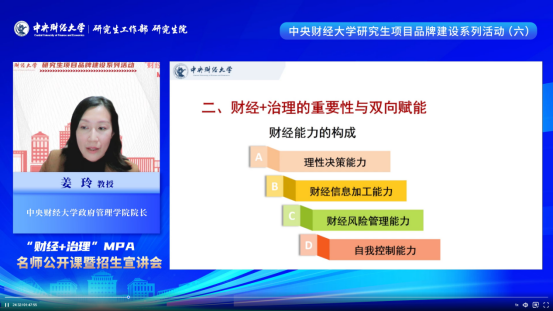 bat365中文官网登录入口院长姜玲教授以“提高财经素养,赋能公共治理”为题,围绕MPA教育的使命和趋势、财经+治理的重要性及双向赋能、财经+治理的内容供给三方面内容,为大家带来了一节干货满满的主题公开课。姜院长指出,面对百年未有之大变局、新技术快速迭代以及新时代新征程新发展阶段的时代背景,复合型知识体系和技能体系、国际和国家战略视野成为现代化公共管理人才的基本素质。公共管理从业者不仅需要遵循公共价值的基本导向,掌握公共管理基础知识体系,还要兼具数智技术与财经领域的工具技能。作为中国财经管理专家的摇篮,中财MPA充分发挥学校特色学科优势,聚焦财经+治理,为MPA人才培养提供特色鲜明的综合性知识供给,围绕财经知识体系、话语体系与能力提升构建系统性培养体系,全面赋能学生成长。最后,姜教授欢迎广大考生积极报考中财MPA,在财经管理专家的摇篮中实现财经+治理的双向赋能,成为懂治理、懂财经的复合型高级人才。