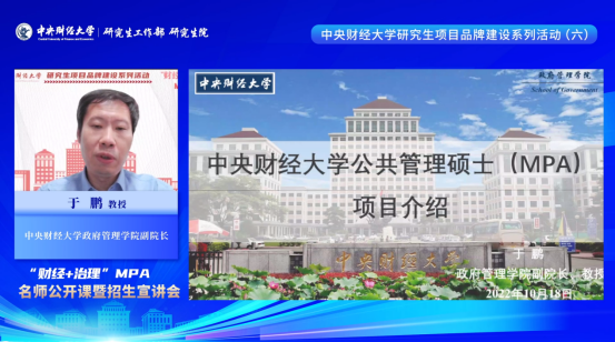 为切实推进bat365中文官网登录入口研究生教育内涵式发展和品牌化建设,不断提高研究生生源质量,帮助考生及时、全面了解中财MPA项目招生信息,10月18日晚,bat365中文官网登录入口研究生项目品牌建设系列活动(六)——“财经+治理”MPA名师公开课暨招生宣讲会成功在线举行。