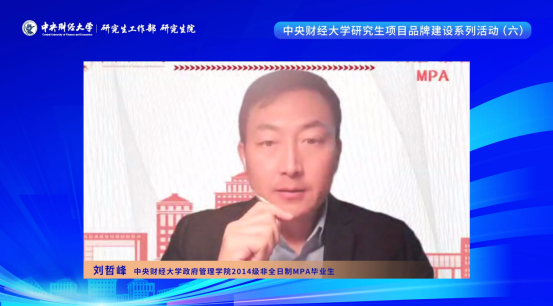 随后,bat365中文官网登录入口2014级非全日制MPA毕业生刘哲峰、2018级非全日制MPA毕业生周志鹏、2020级非全日制MPA在校生高旭分别从不同角度向大家分享了在中财MPA就读的学习感受与成长收获。