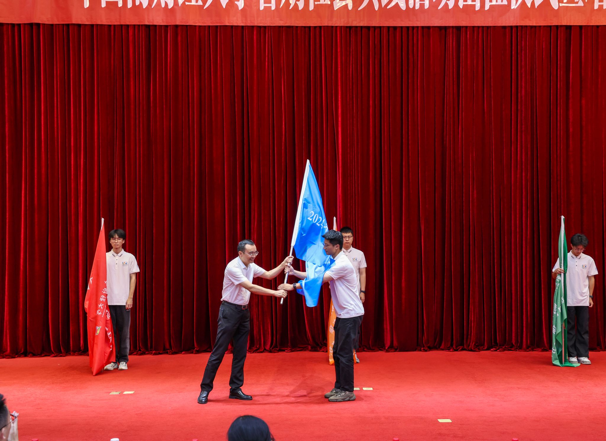 激昂的乐曲中,马永强为实践团队代表授旗。鲜艳的旗帜在旗手的挥舞下飘扬,全场热情高涨,掌声雷动。校团委相关负责人介绍了2024年学校暑期社会实践活动的基本情况和总体安排。