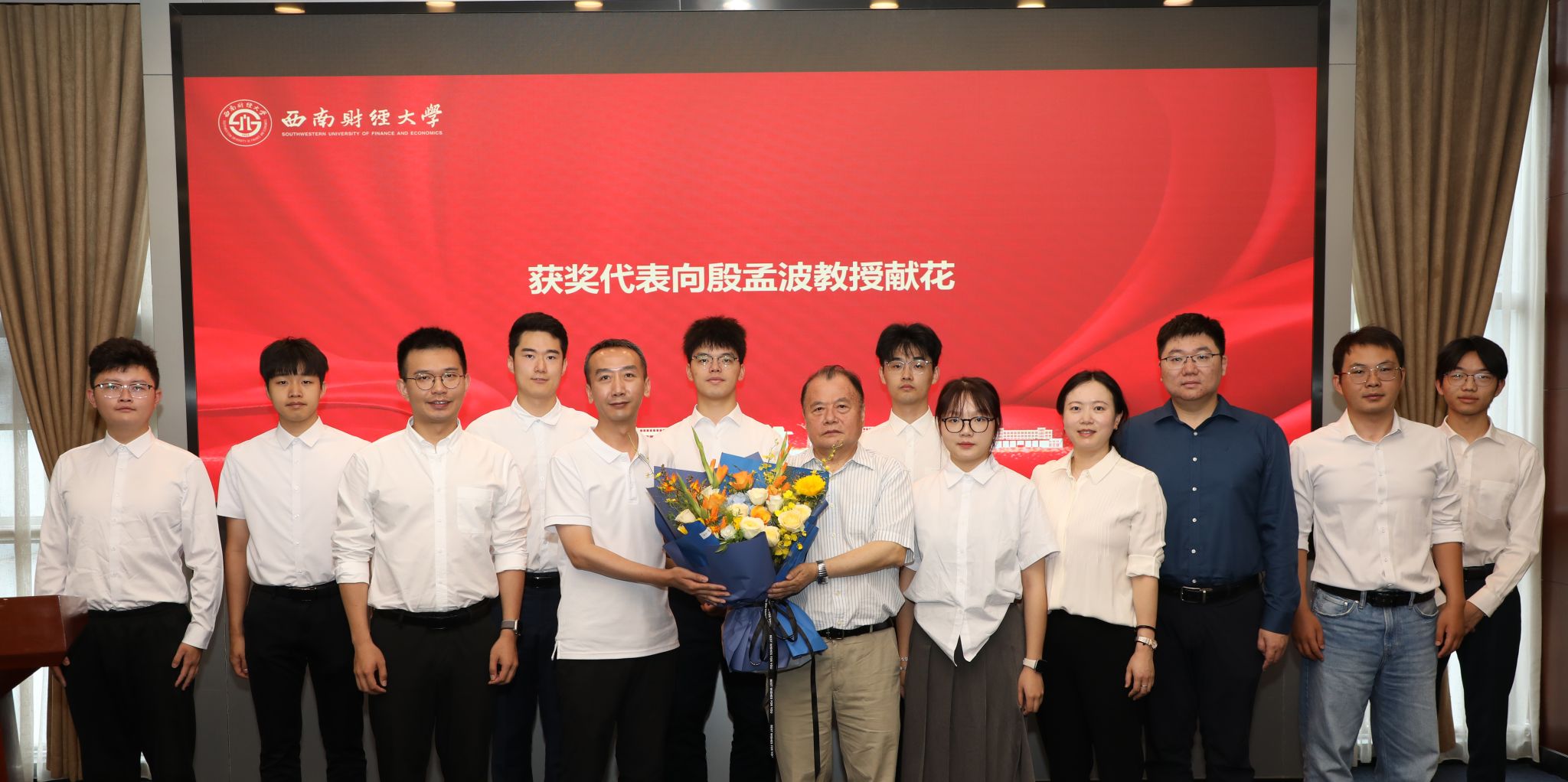 王擎宣读获奖决定。殷孟波、尹庆双、王擎和学院(研究院)负责人为获奖师生颁奖。获奖师生向殷孟波教授献花,表达诚挚感谢和深深敬意。