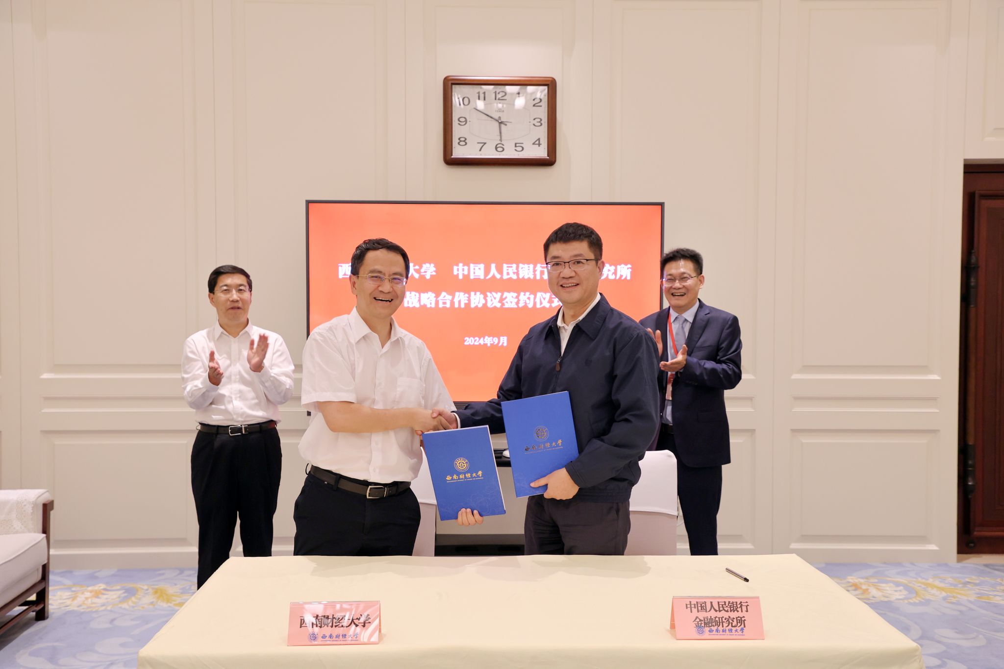 9月24日,学校与中国人民银行金融研究所战略合作协议签约仪式在成都举行。学校党委书记赵建军,党委常委、副校长王擎;中国人民银行金融研究所所长丁志杰,副所长雷曜,中国人民银行四川省分行党委委员、副行长廖凤华出席签约仪式。