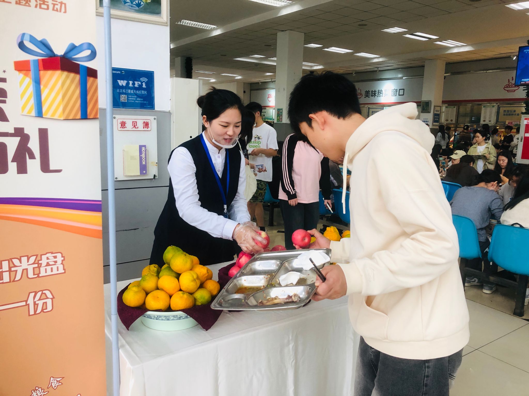 为鼓励师生“餐餐光盘”,倡导师生“从我做起”,在午餐时段,学校组织开展“光盘行动,礼赞节约”兑换活动。各食堂均设立“光盘”打卡点,提倡节俭节约生活方式,并以兑换水果作为奖励。组建光盘监督岗学生志愿者队伍,提醒师生按量取餐,不剩饭、不剩菜,积极倡导文明用餐。师生们踊跃参与,争做勤俭节约、珍惜粮食的传承者、实践者和引领者。