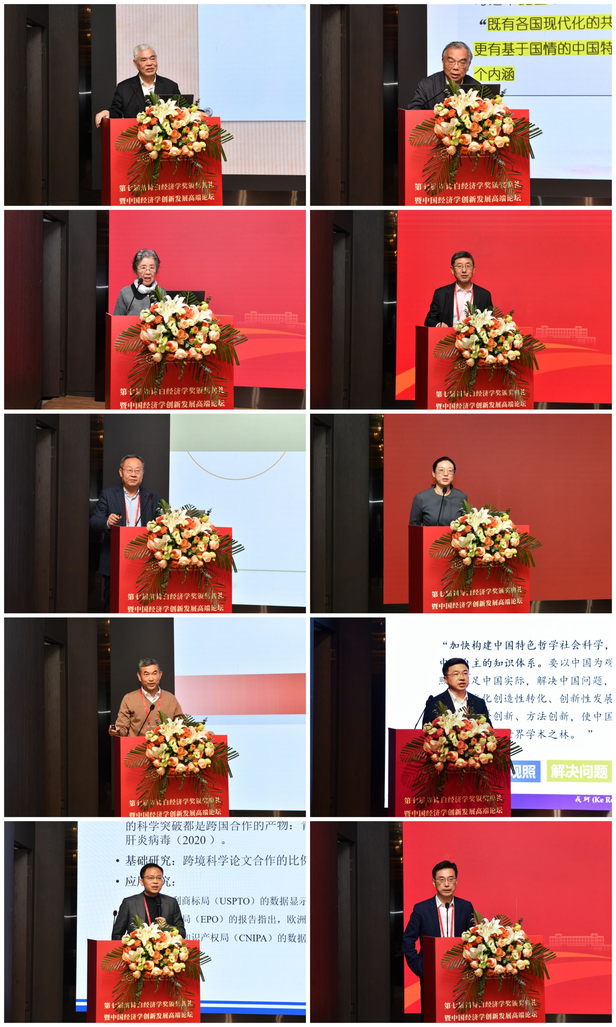 颁奖典礼后,大会以“中国式现代化与中国经济学自主知识体系建构”为主题举行中国经济学创新发展高端论坛。洪银兴、顾海良等专家学者分别以“新质生产力与中国经济学知识体系构建”“中国式现代化的思想进程和理论精粹”“新质生产力理论丰富和拓展了习近平经济思想”为题作主旨报告。中央民族大学原校长黄泰岩教授、南京大学数字经济与管理学院院长任保平教授、黄薇教授、周亚虹教授、戎珂教授、李涵教授分别围绕“构建中国经济学自主知识体系的首要任务”“中国经济学自主知识体系构建中新质生产力的形成逻辑”“人工智能对经济学研究与发展的影响”“乡村数字化助力中国式现代化”“对中国经济学自主知识体系建构的思考和尝试:以数据要素基础理论为例”“要素跨境流动与创新”进行主题演讲。主旨报告和主题演讲分别由刘灿教授和beat365vip官网校长助理、经济学院院长盖凯程教授主持。