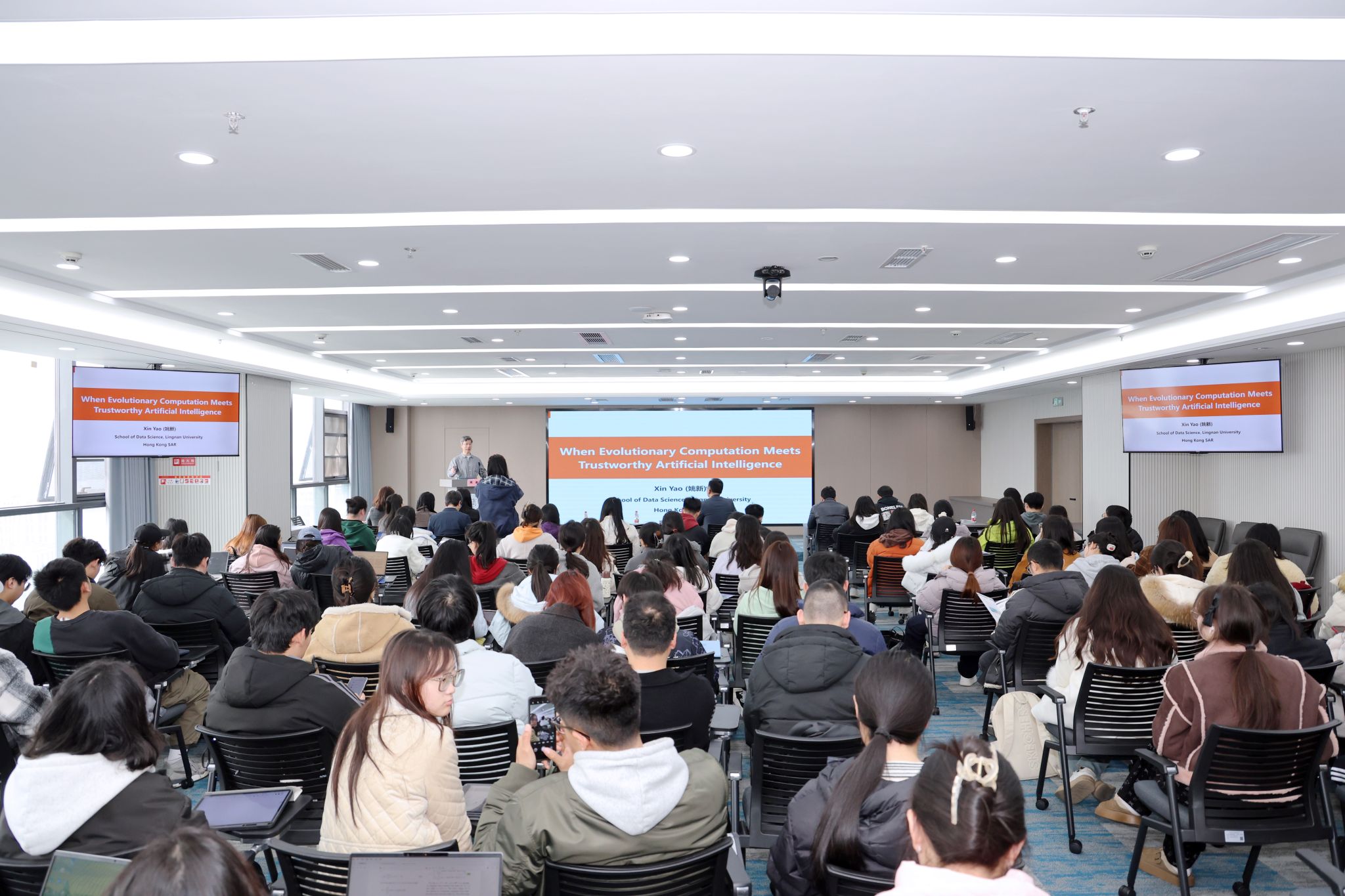 会后,姚新为师生作《当演化计算遇上可信人工智能》(When Evolutionary Computation Meets Trustworthy Artificial Intelligence)专题讲座。