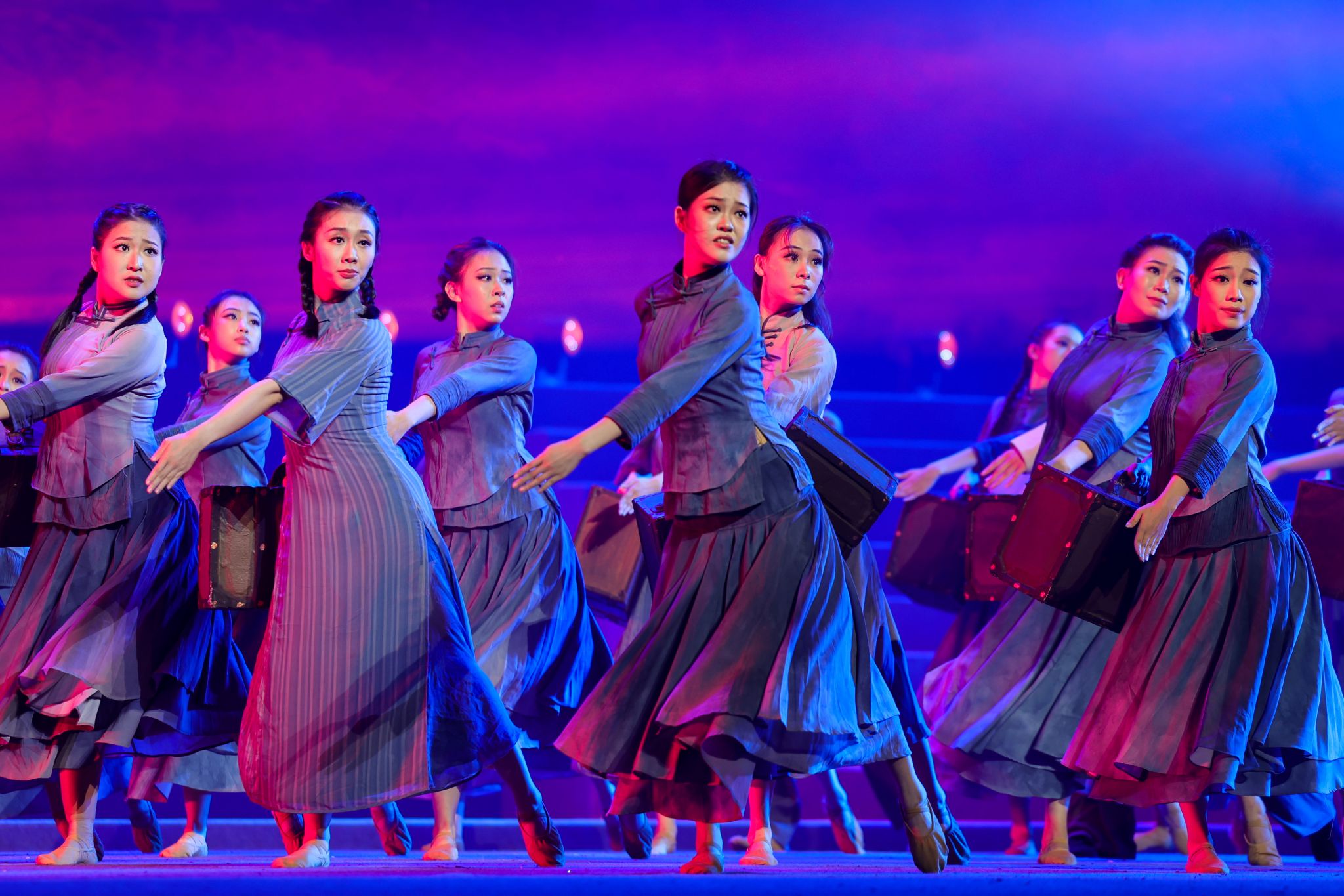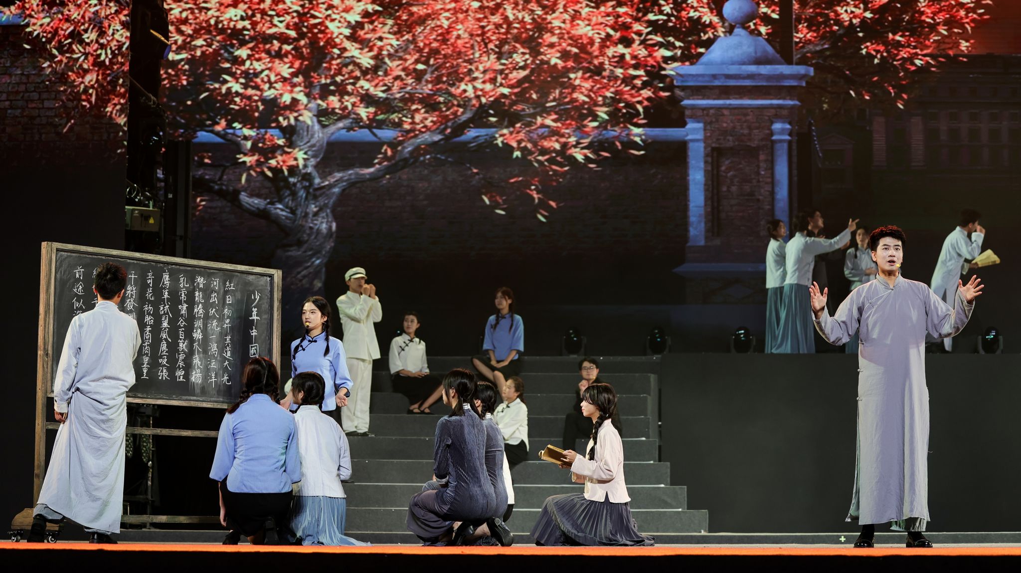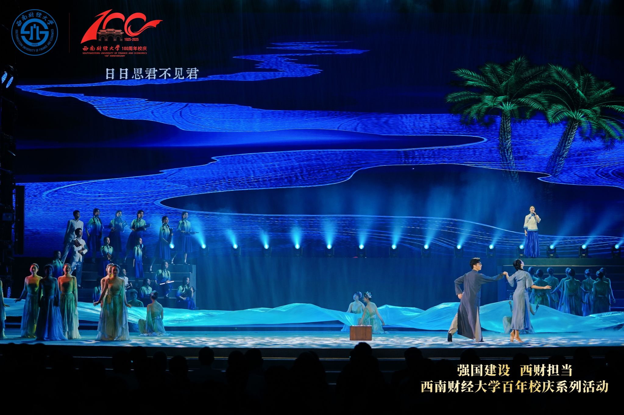歌舞《别・一脉两支》以水墨长卷为背景,展现上海光华大学与成都分部“一脉两支、同根同源”的历史脉络。演员以壮美舞姿演绎长江奔腾之态,舞者的凝眸回望,传递出两地学府的同根情谊。