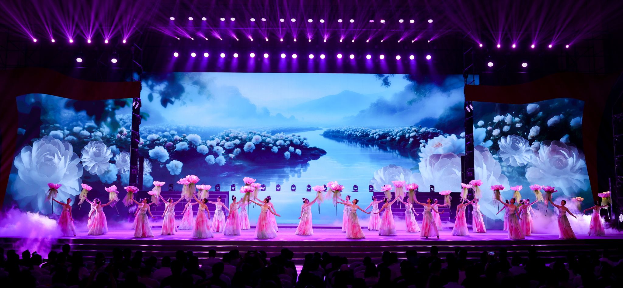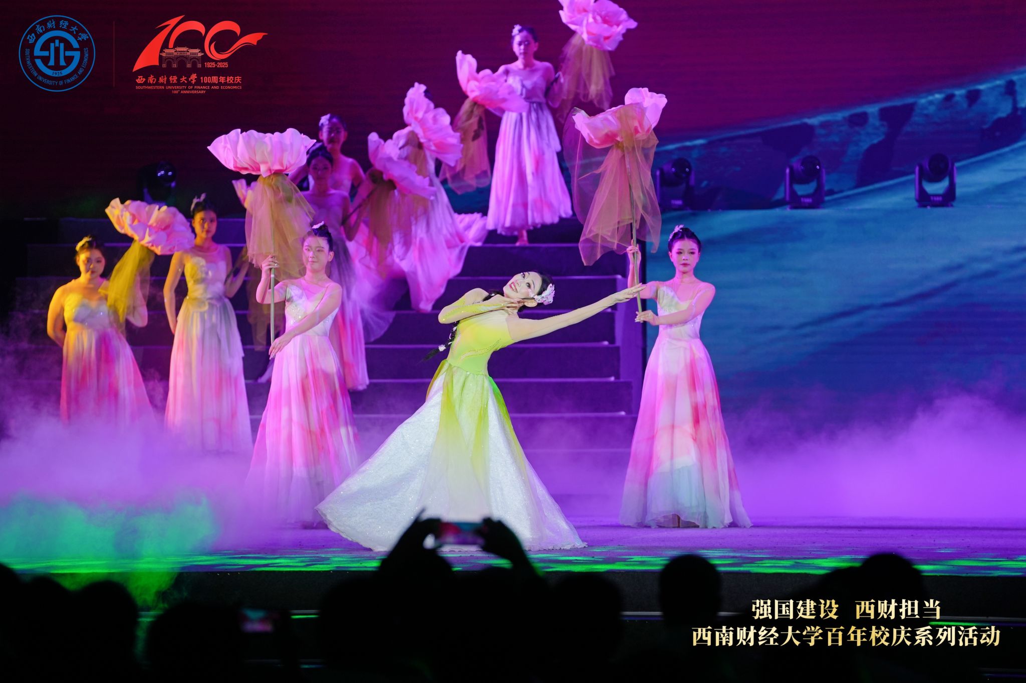 芙蓉花瓣在光影中随风摇曳,舞蹈《浣花溪畔》如诗意画卷将光华大学成都分部的动人故事徐徐展开。演员们手执芙蓉花,以轻盈的舞步生动重现谢霖校长带领师生种植光华铁树的历史场景。