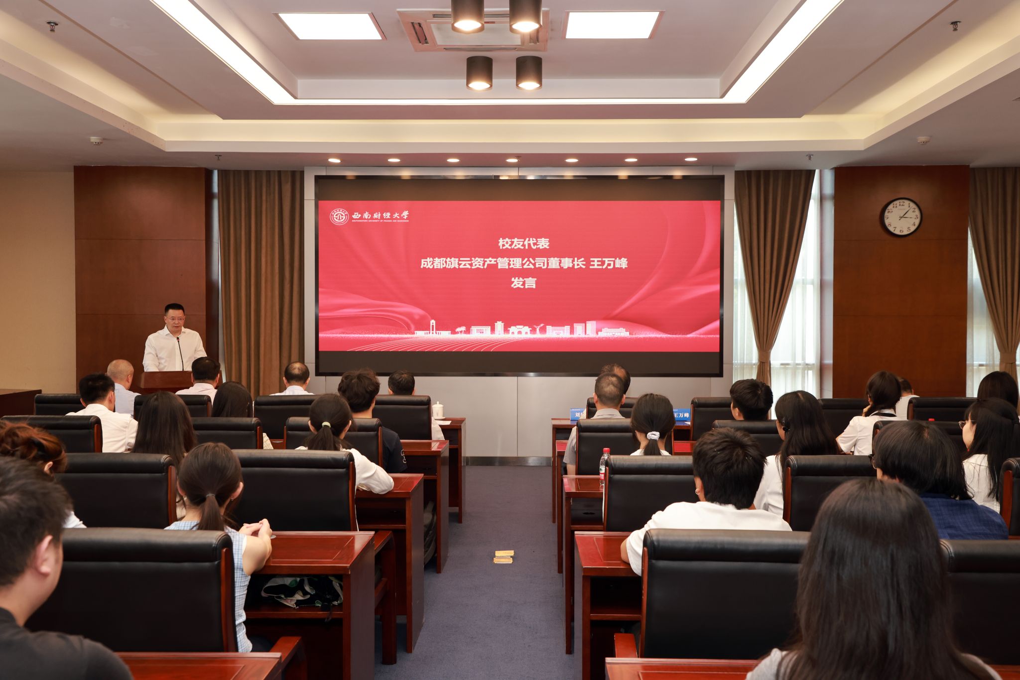 校友代表成都旗云资产管理公司董事长王万峰在发言中向母校的悉心栽培和恩师的谆谆教诲表示衷心感谢,鼓励同学们珍惜时光、不负韶华,为加快建设金融强国贡献青春力量。