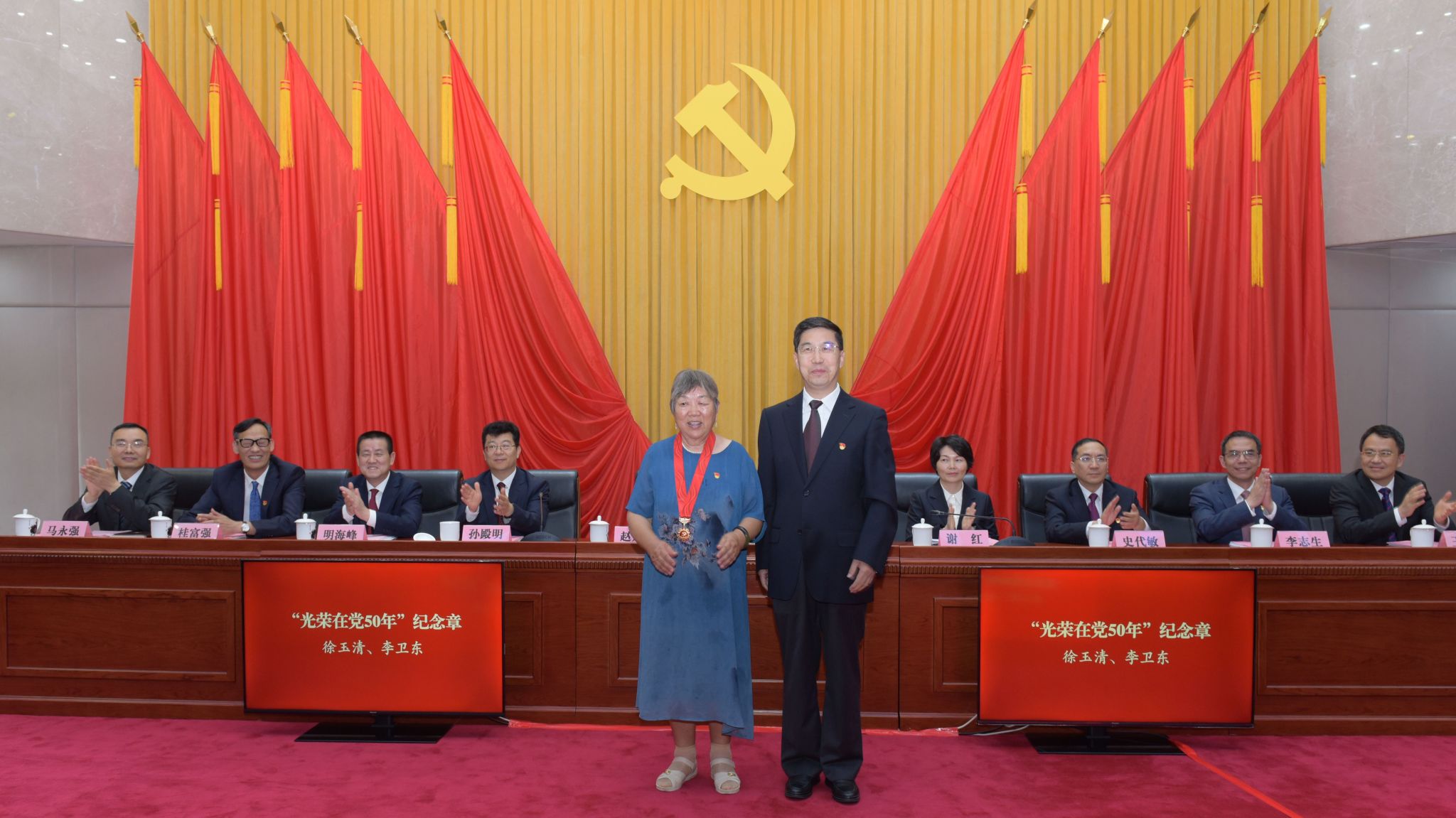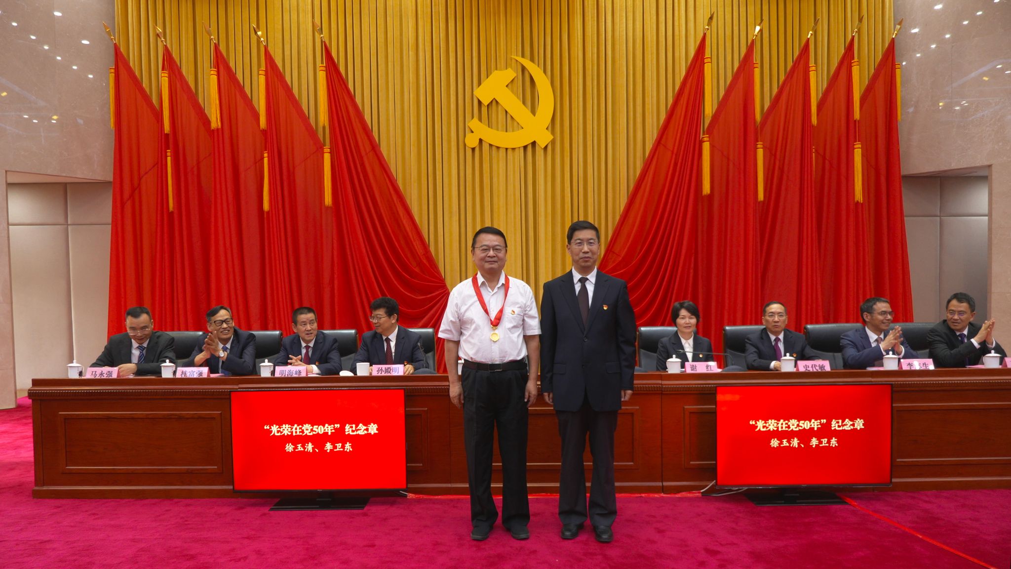 赵建军为徐玉清、李卫东两位老同志颁发“光荣在党50年”纪念章。