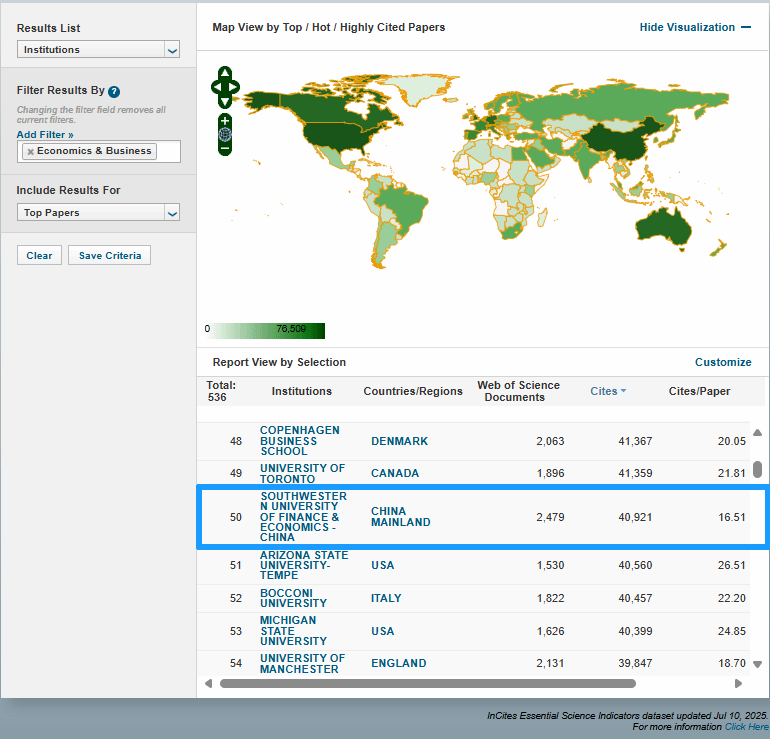 7月10日,根据科睿唯安(Clarivate Analytics)公布的ESI(基本科学指标数据库)最新数据,beat365vip官网经济学与商学(ECONOMICS & BUSINESS)进入ESI全球前1‰学科行列,位居全球第50位、中国第2位,标志着beat365在该领域的学科竞争力和国际影响力迈上新台阶。
