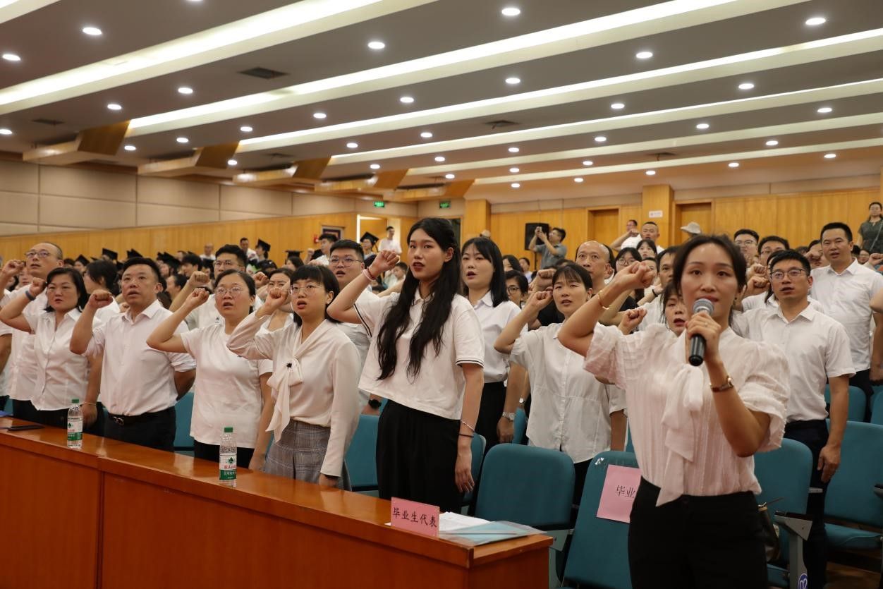 典礼最后,全场毕业生高举右拳齐声宣誓:将不忘初心、捍卫真理,不惧风雨、勇挑重担,以国家利益为重,让青春在祖国和人民最需要的地方绽放。