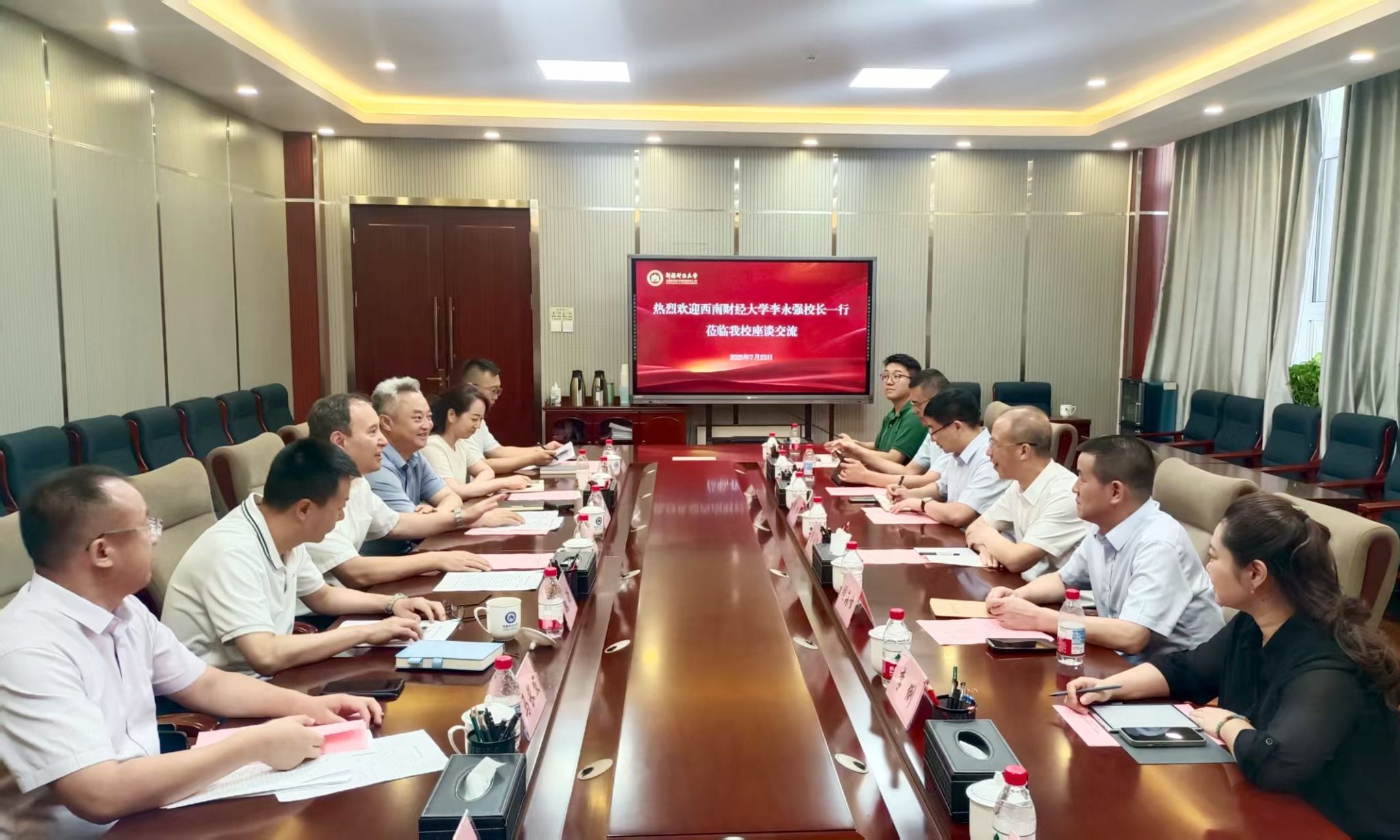 在新疆财经大学,李永强介绍了学校百年校庆基本情况和正在推进的重大改革、“十五五”规划编制初步设想,期待两校加强合作,共谱财经教育新篇。双方就学科建设、产教融合、人才引进、考核评价、学生工作及少数民族学生就业等进行深入探讨。新疆财经大学党委副书记、校长居来提·吐尔地,党委副书记王玉刚出席座谈交流会。
