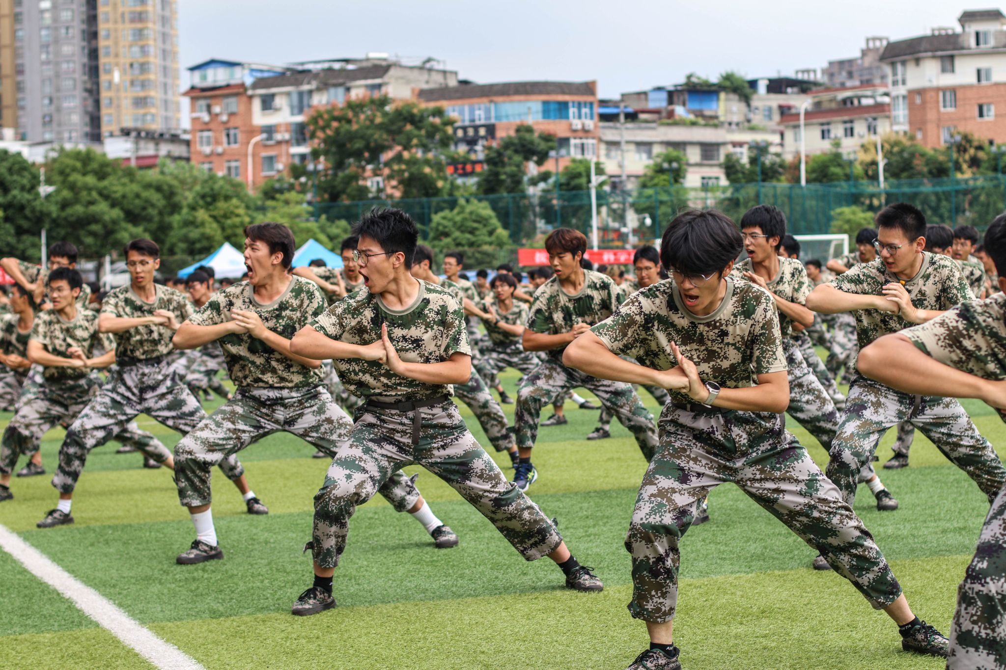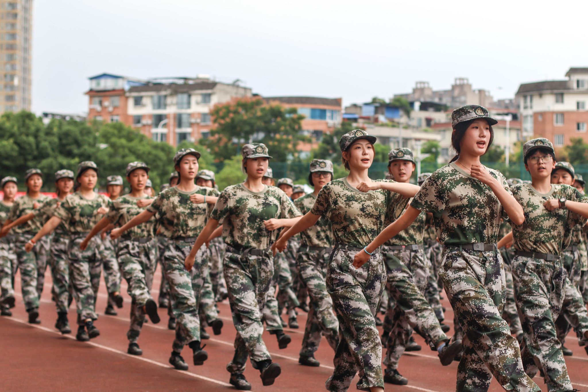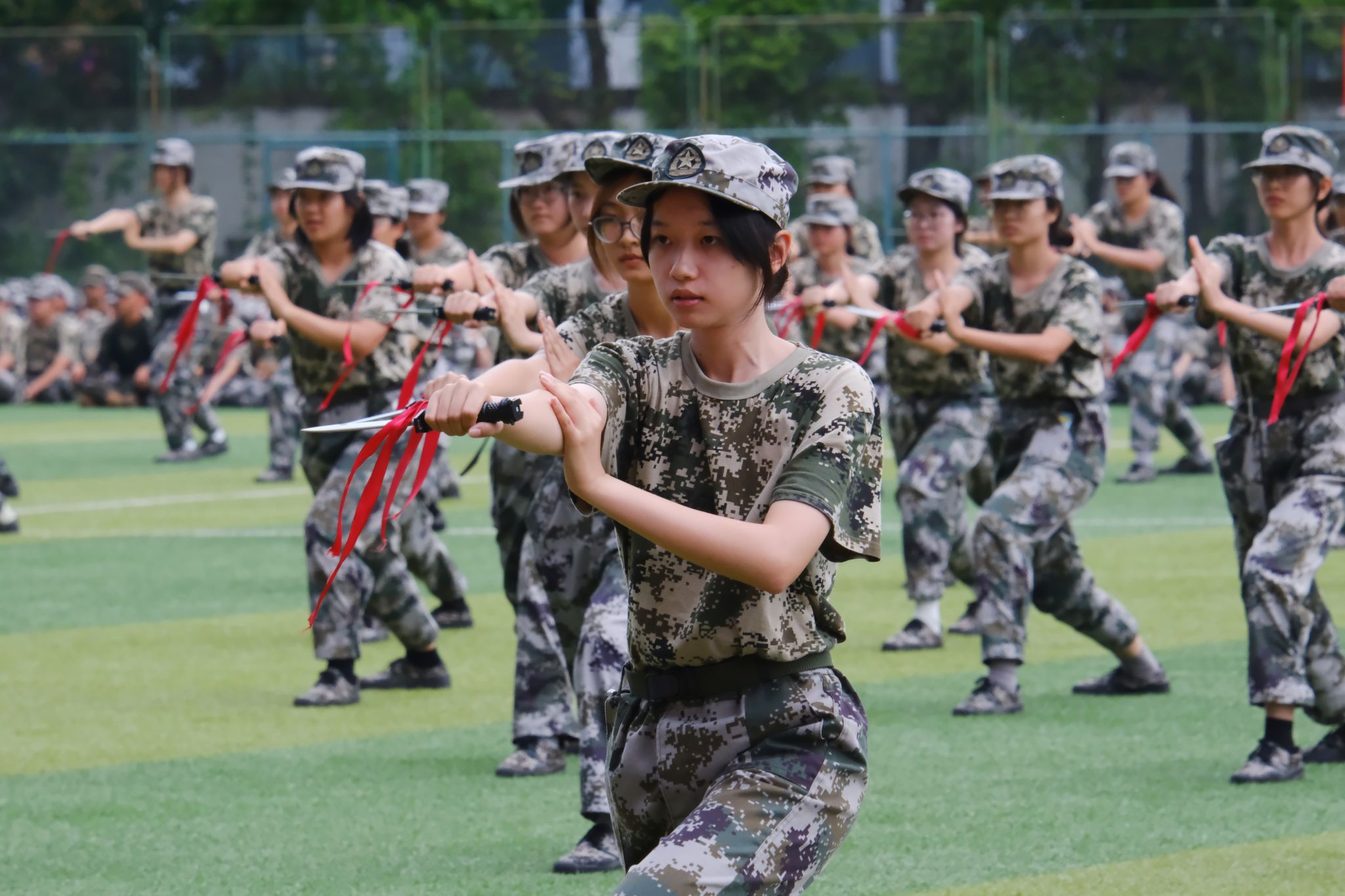赵建军宣布军训总结展示开始。分列式方阵以规整划一的步伐展现严明纪律;匕首操方阵凭利落精准的动作彰显飒爽姿态;擒敌方阵用刚劲有力的招式迸发强劲气势;警棍方阵持械而立,神情专注且气场沉稳;救护方阵规范娴熟,操作显专业细致;战术方阵则在模拟场景中默契配合、灵活应变。从步伐一致的协同到专业技能的运用,每一支方阵都折射出学子们褪去青涩后的成长,既传承了军人的坚毅品格,也将青春活力与进取精神融入其中,为这段军训时光画上了圆满句号。