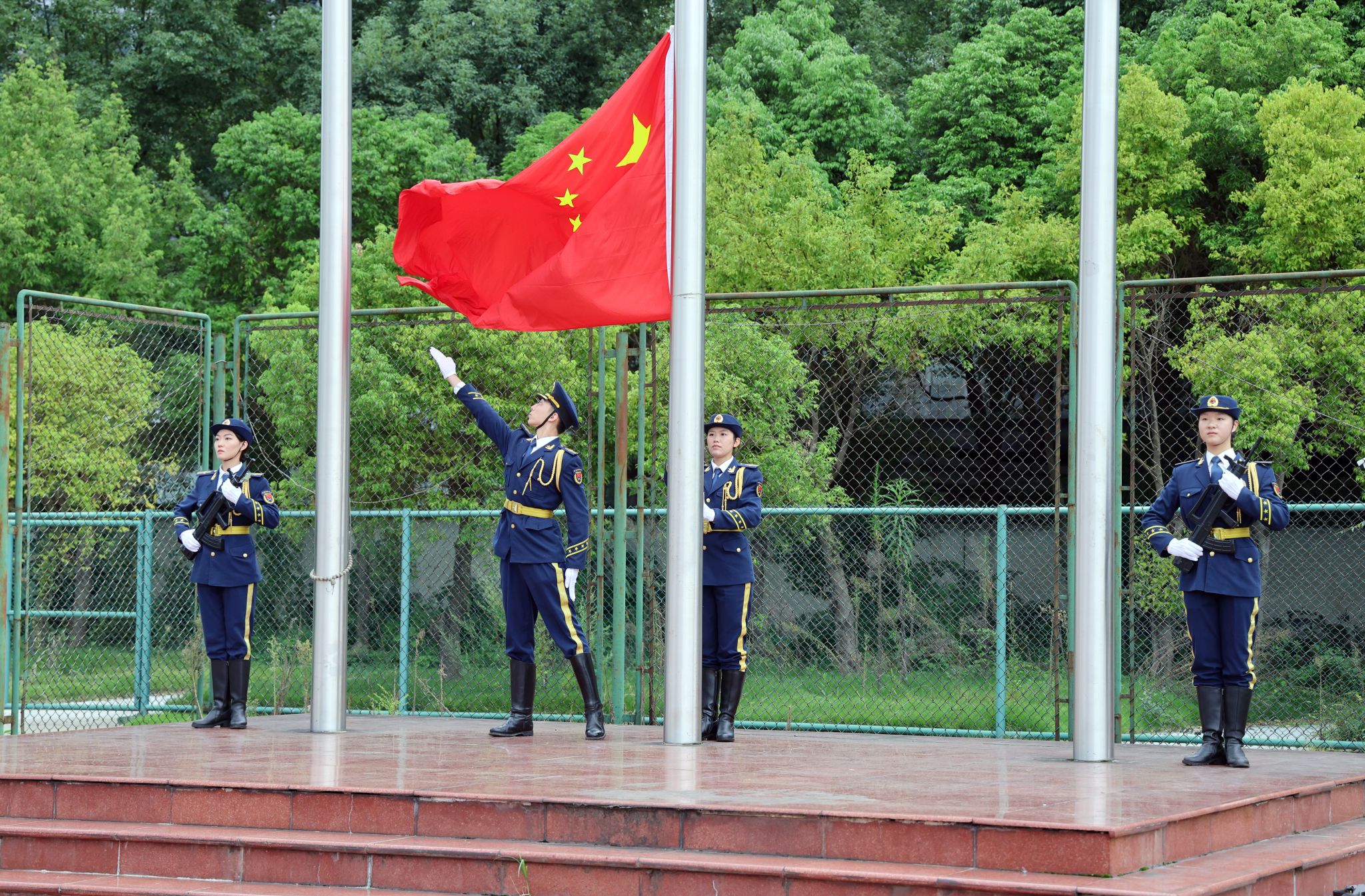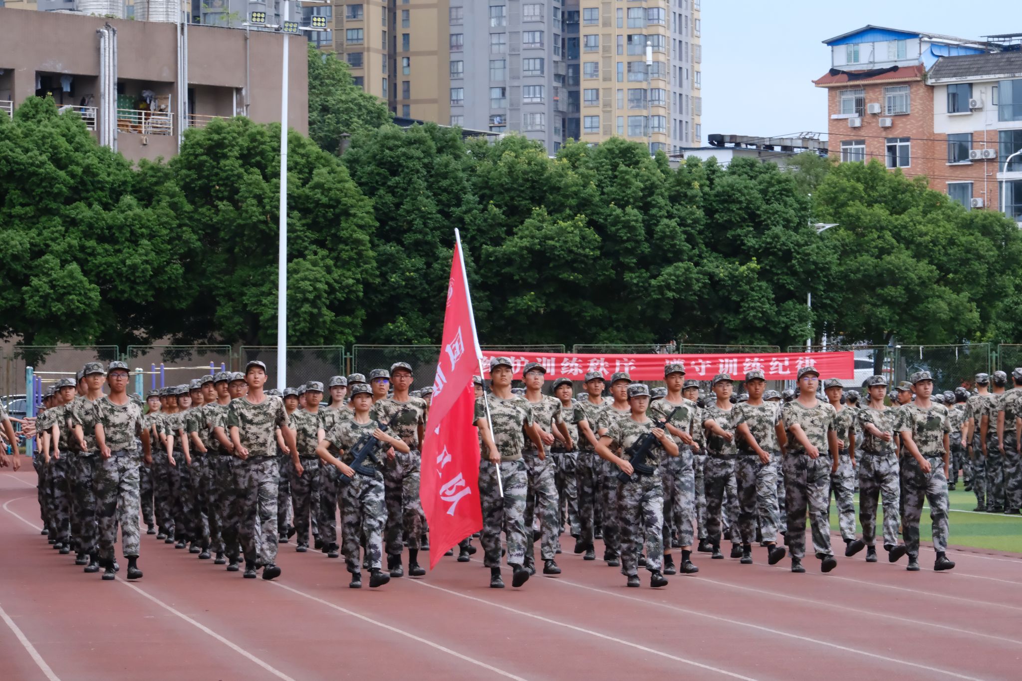 伴随着庄严嘹亮的国歌声,军训总结大会拉开帷幕。