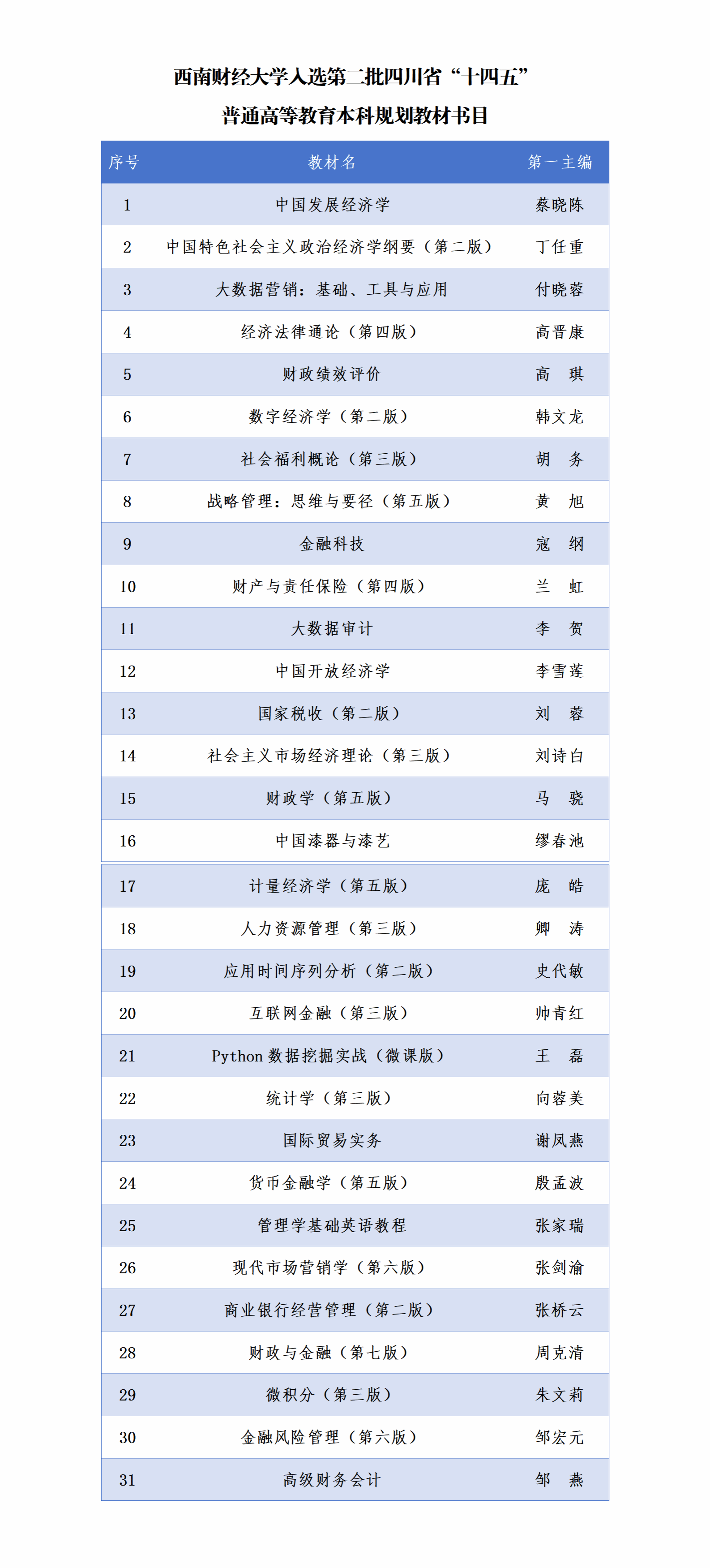 近日,四川省教育厅发布《关于公布第二批四川省“十四五”普通高等教育本科规划教材书目的通知》,beat365《中国开放经济学》等31部教材入选,覆盖经济学、管理学、法学、理学等多个学科领域。截至目前,学校共有48部教材入选四川省“十四五”普通高等教育本科规划教材。