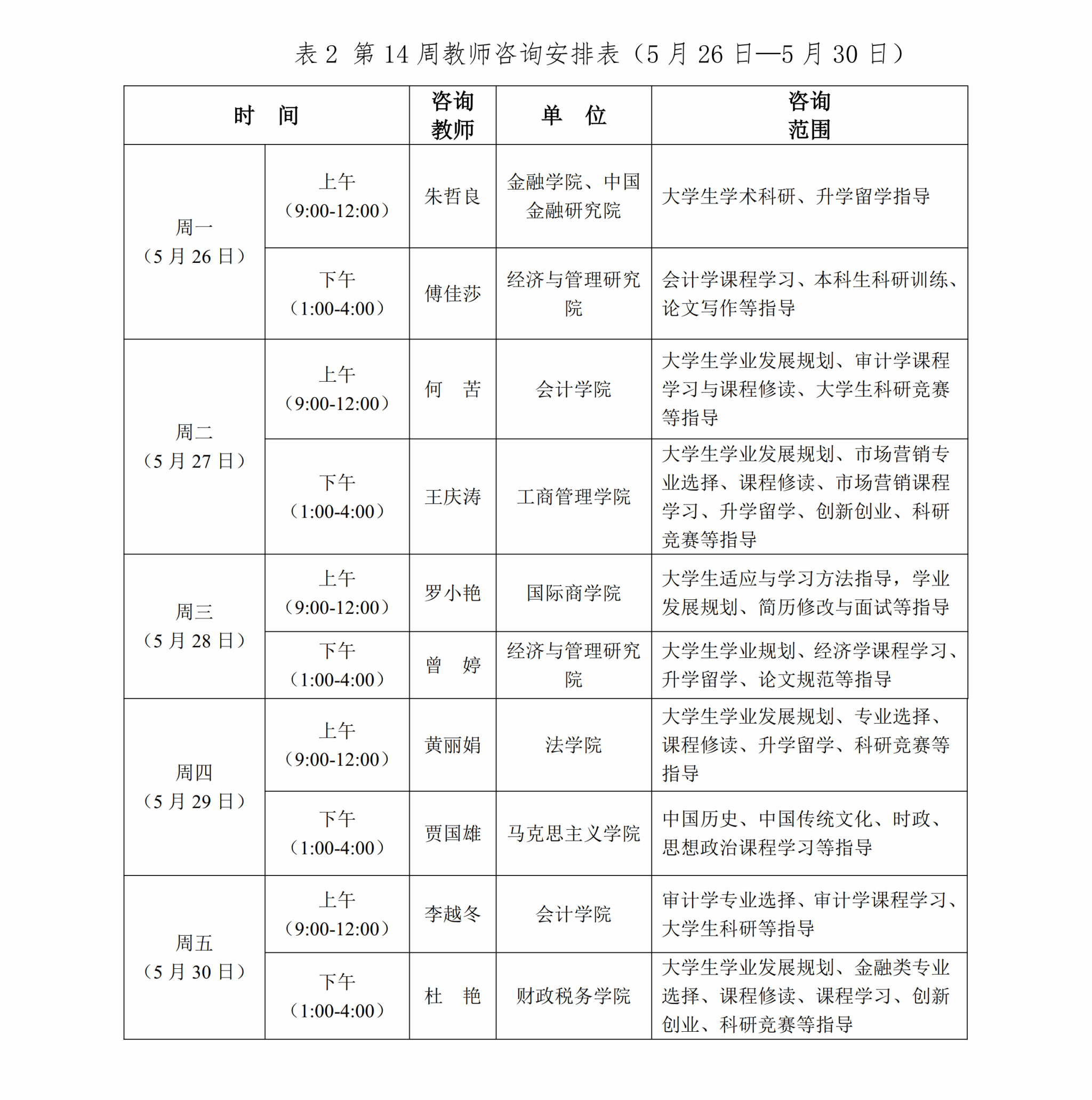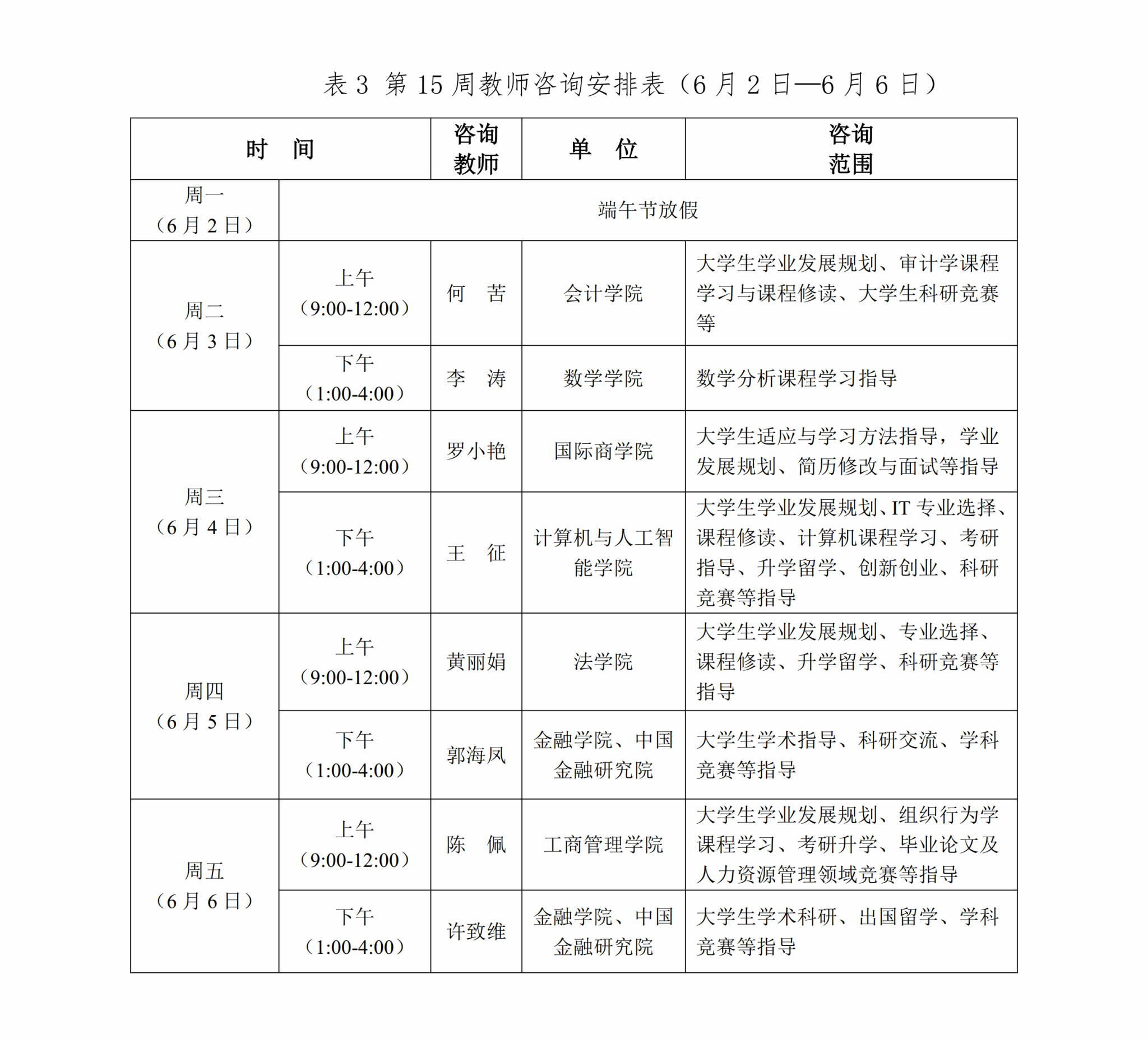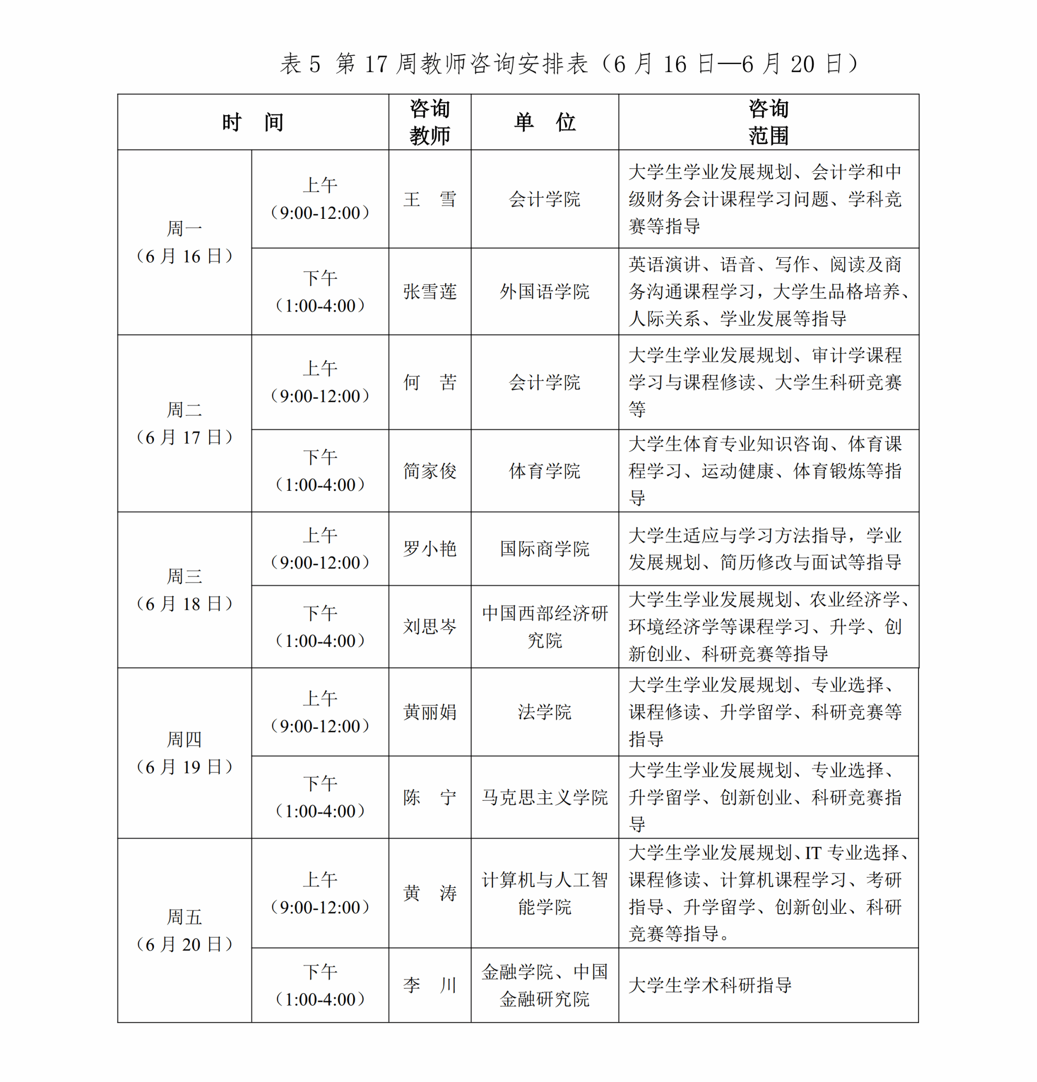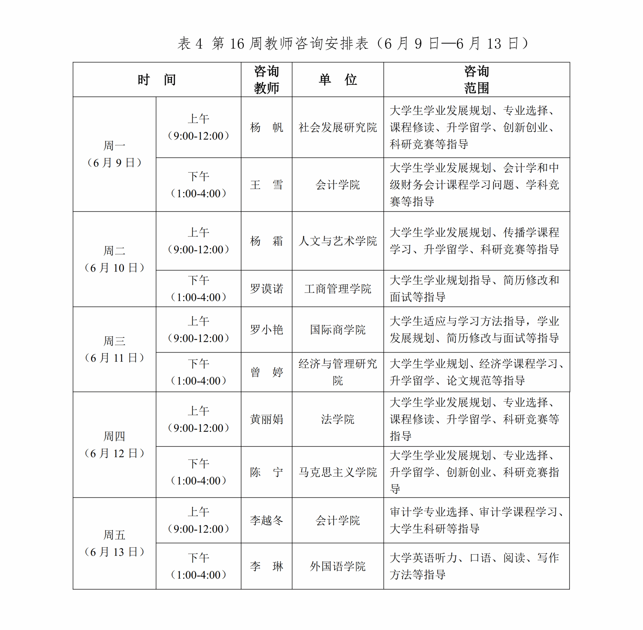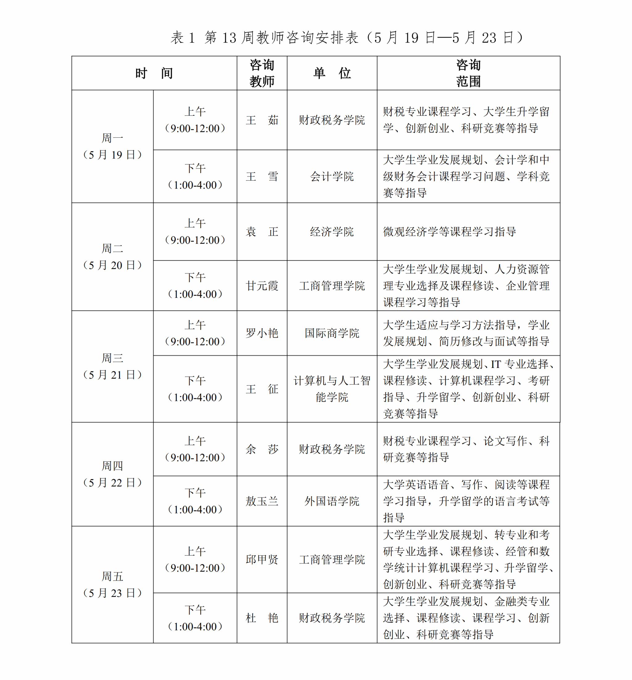 为推进课程教学范式深彻转变,促进同学们学习理念、习惯、方式与时俱进,丰富大家在校学习体验,提供学业规划、学科内容、学业流程等方面的咨询答疑,现将本学期第十三至十七周(5月19日—6月20日)教师咨询安排通知如下: