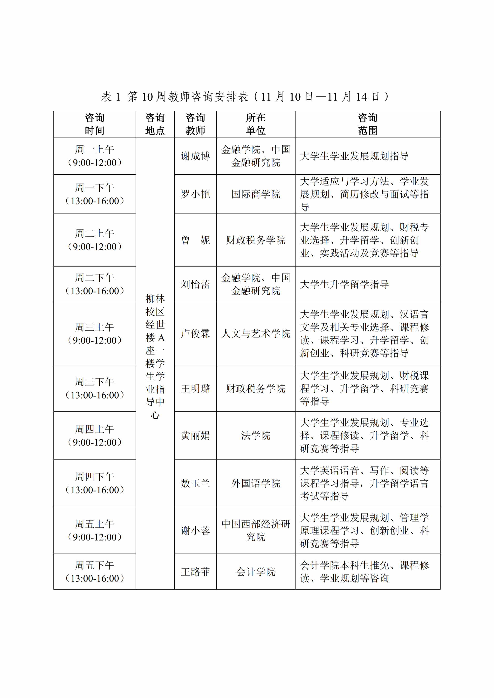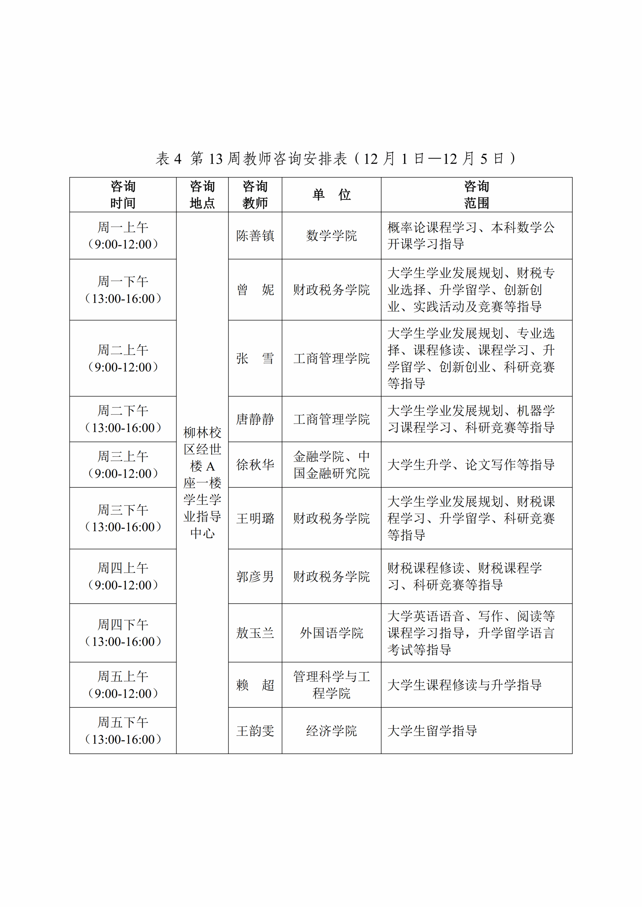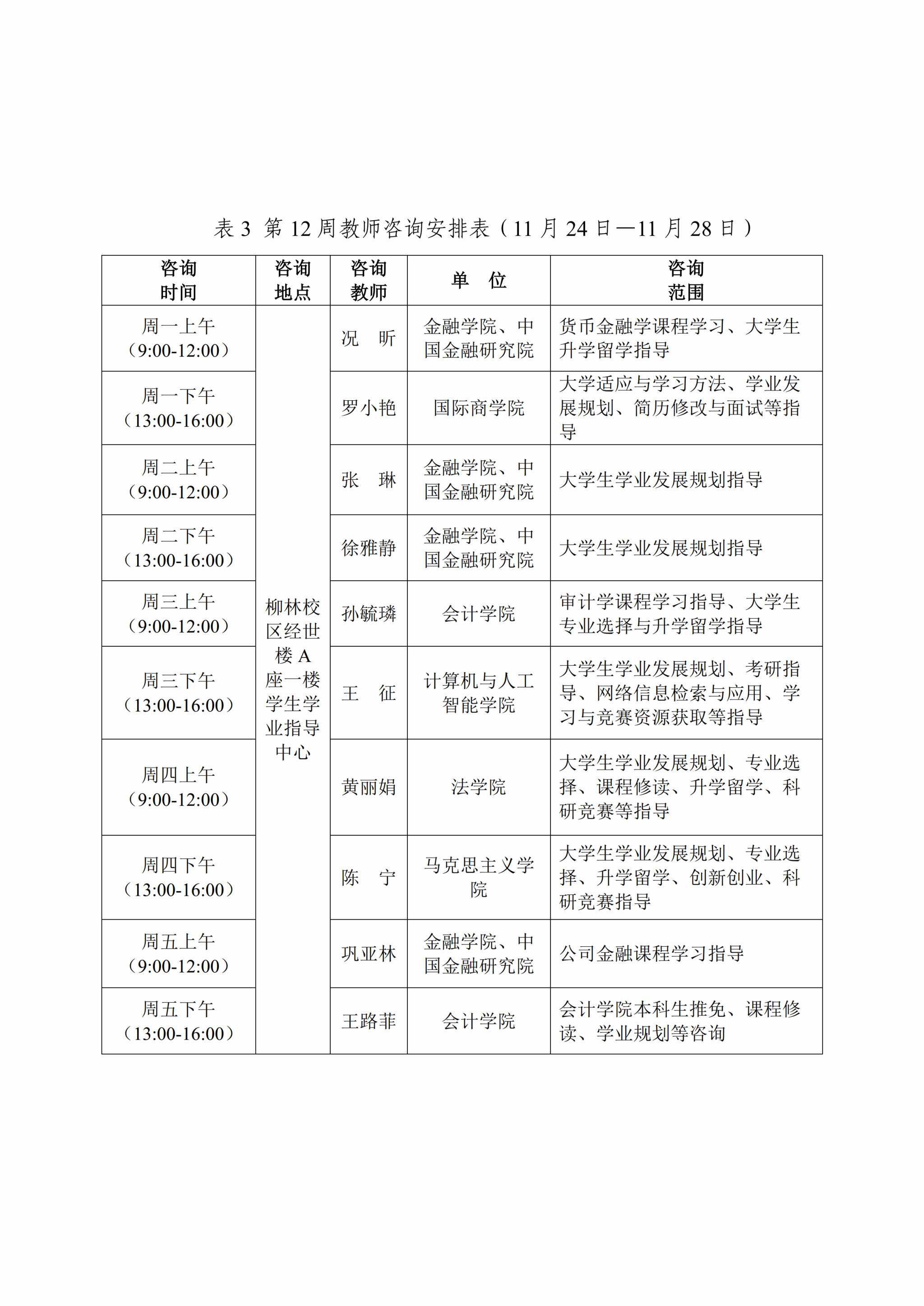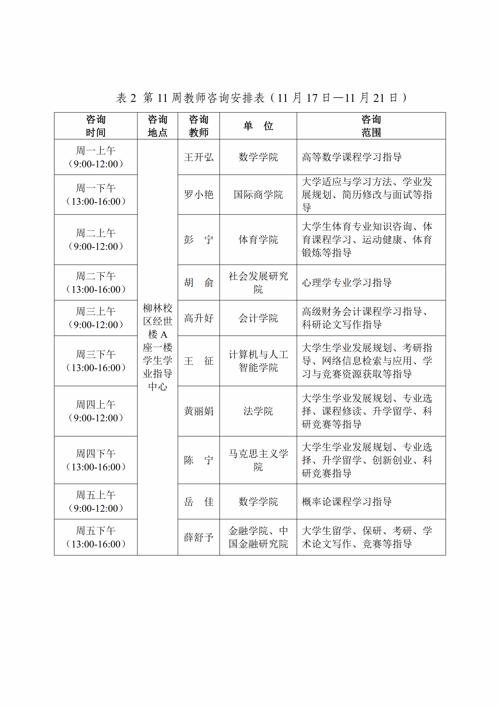 为推进课程教学范式深彻转变,促进同学们学习理念、习惯、方式与时俱进,丰富大家在校学习体验,提供学科内容、学业流程等方面的咨询答疑,现将本学期第10至13周(11月10日—12月5日)教师咨询安排通知如下: