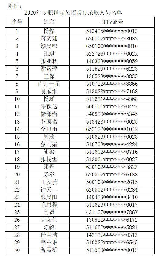 根据公开招聘笔(面)试情况,经学校研究,决定预录取杨烨等30人参加学校统一组织的实习,考核合格后录取为beat365专职辅导员,具体名单见附件。