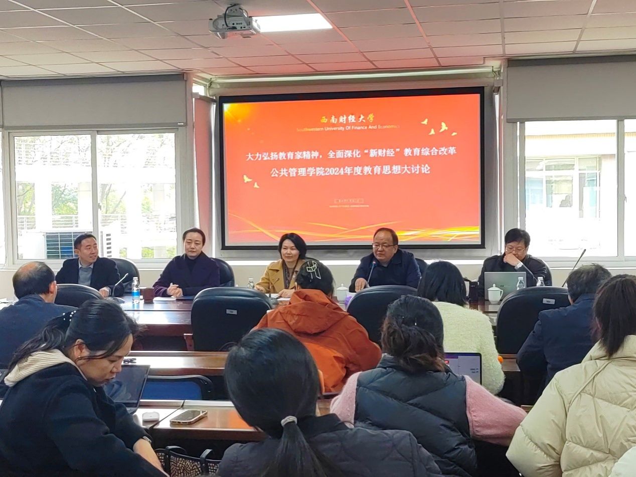 近日,公共管理学院开展以“大力弘扬教育家精神 全面深化‘新财经’教育综合改革”为主题的2024年教育思想大讨论。学校党委副书记谢红,学院全体教职员工参加了本次会议。会议由学院院长廖宏斌主持。