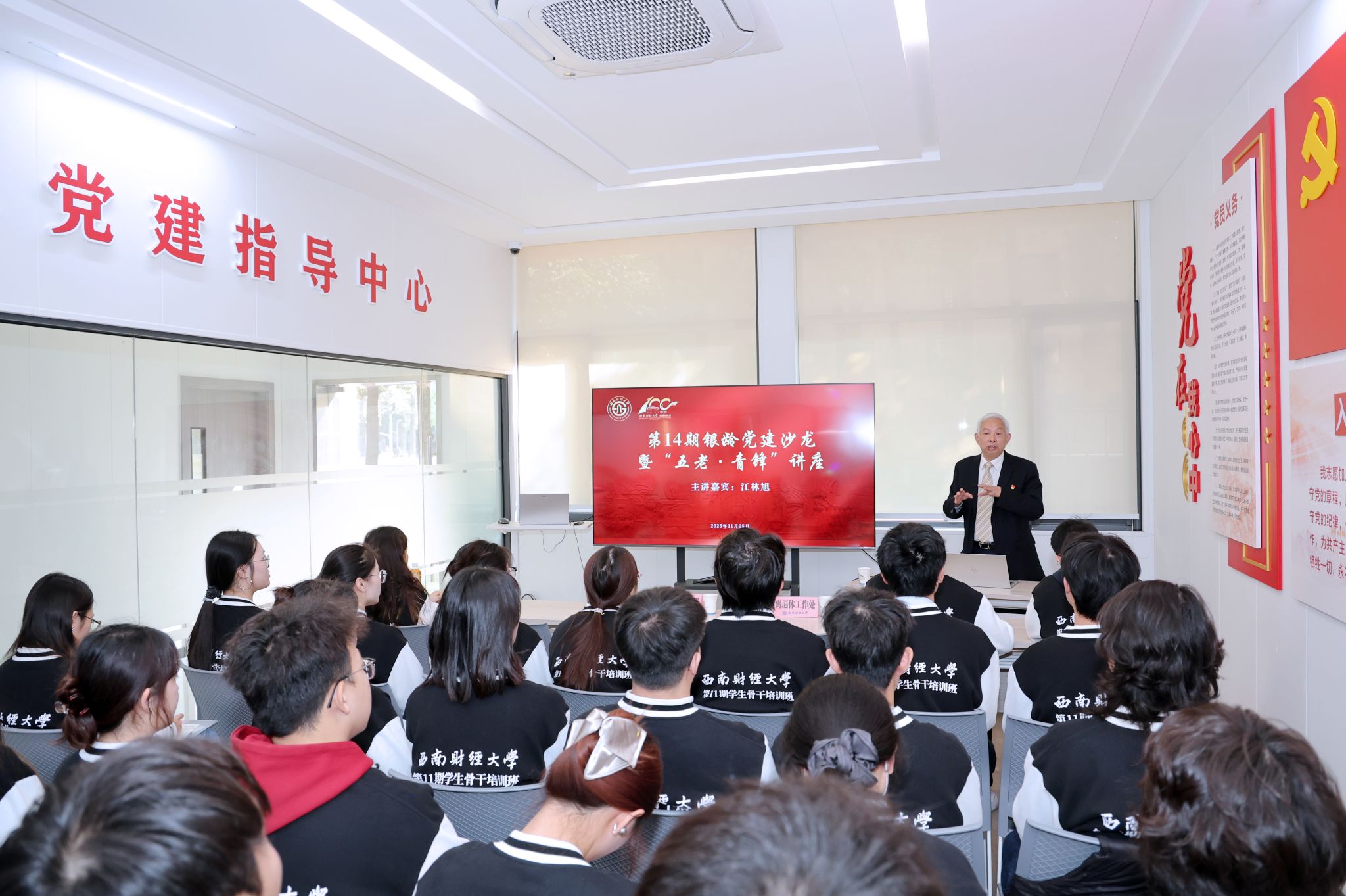11月25日,学校在光华校区“一站式”学生事务服务大厅党员活动室举办第14期银龄党建沙龙暨“五老·青锋”专题讲座。学校关心下一代工作委员会副秘书长江林旭以“为深入学习贯彻党的二十届四中全会精神,厚植百年beat365情怀底色”为主题,为党建指导中心、第11期学生骨干培训班、“青”系桑榆敬老志愿服务队等80余名学员讲授思政大课。