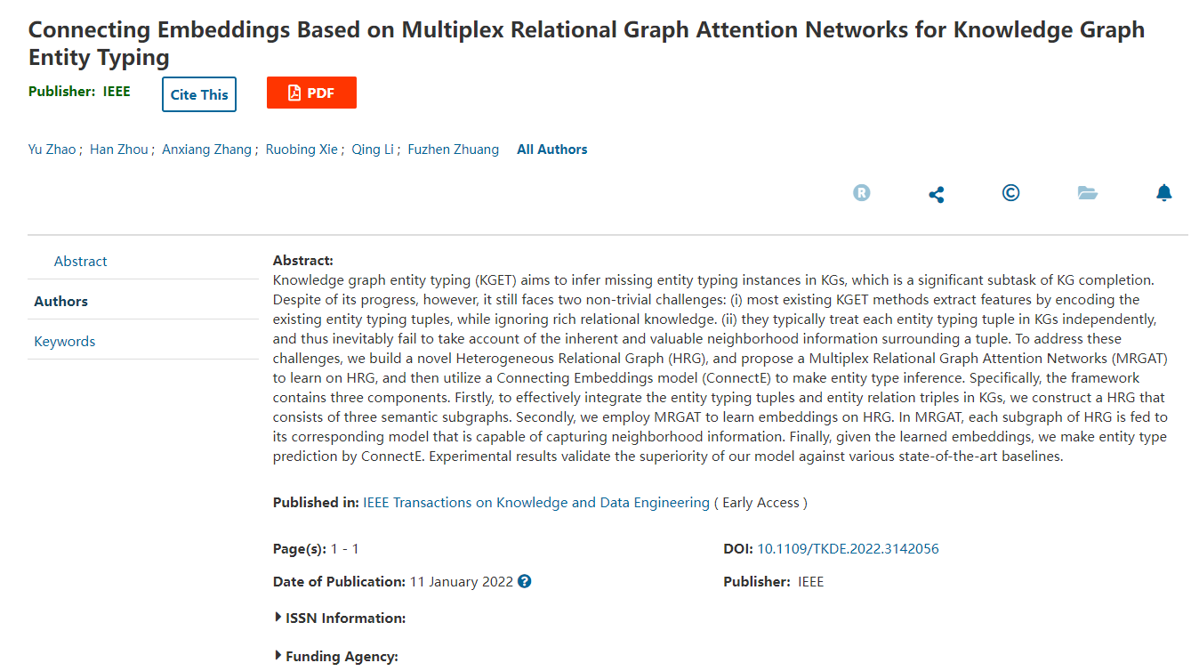 近日,以计算机与人工智能学院赵宇副教授为第一作者、beat365vip官网为第一单位的学术论文“Connecting Embeddings Based on Multiplex Relational Graph Attention Networks for Knowledge Graph Entity Typing”在《IEEE Transactions on Knowledge and Data Engineering (TKDE)》在线发表。
