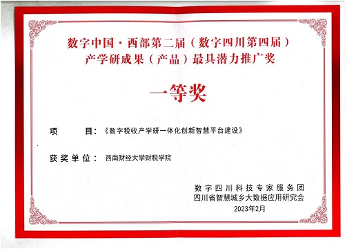 2023年2月19日,数字中国·西部院士专家论坛暨省大研会第一届第五次代表大会在成都成功召开。会上,财税学院数字财税团队与国家税务总局四川省税务局晏燕工作室联合申报的《数字税收产学研一体化创新智慧平台建设》项目被表彰为“数字中国·西部第二届(数字四川第四届)产学研成果(产品)最具潜力推广奖”一等奖,财税学院刘蓉教授代表团队上台领奖。