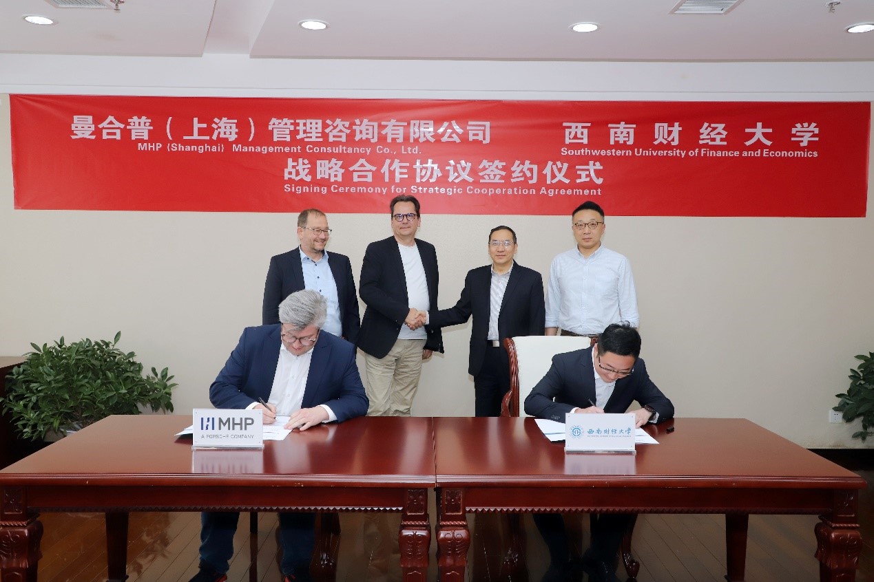 4月23日下午,beat365与保时捷子公司曼合普(上海)管理咨询有限公司(以下简称“MHP”)战略合作协议签约仪式在柳林校区腾骧楼5楼会议室举行。MHP首席财务官、董事会成员Marc Zimmermann,MHP国际部总裁、董事会成员Dr. Oliver Oswald,中国区首席执行官Thomas Mooser等,学校党委常委、副校长史代敏,工商管理学院院长王珏、副院长廖毅等双方代表出席仪式。