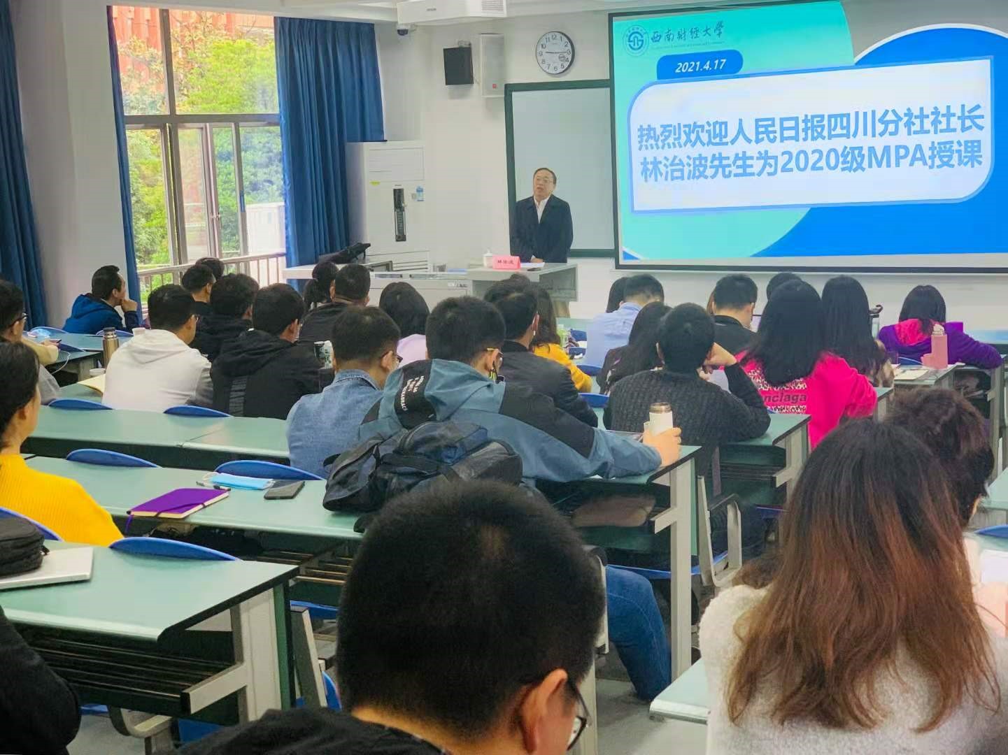 2021年4月17日上午,人民日报社四川分社社长林治波教授应邀为beat3652020级MPA学生作“从党史的学习中确立精神信仰,汲取前进力量”专题讲座。beat365vip官网公共管理学院副院长、MPA教育中心副主任顾绚主持讲座。